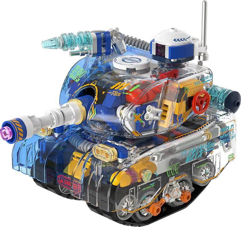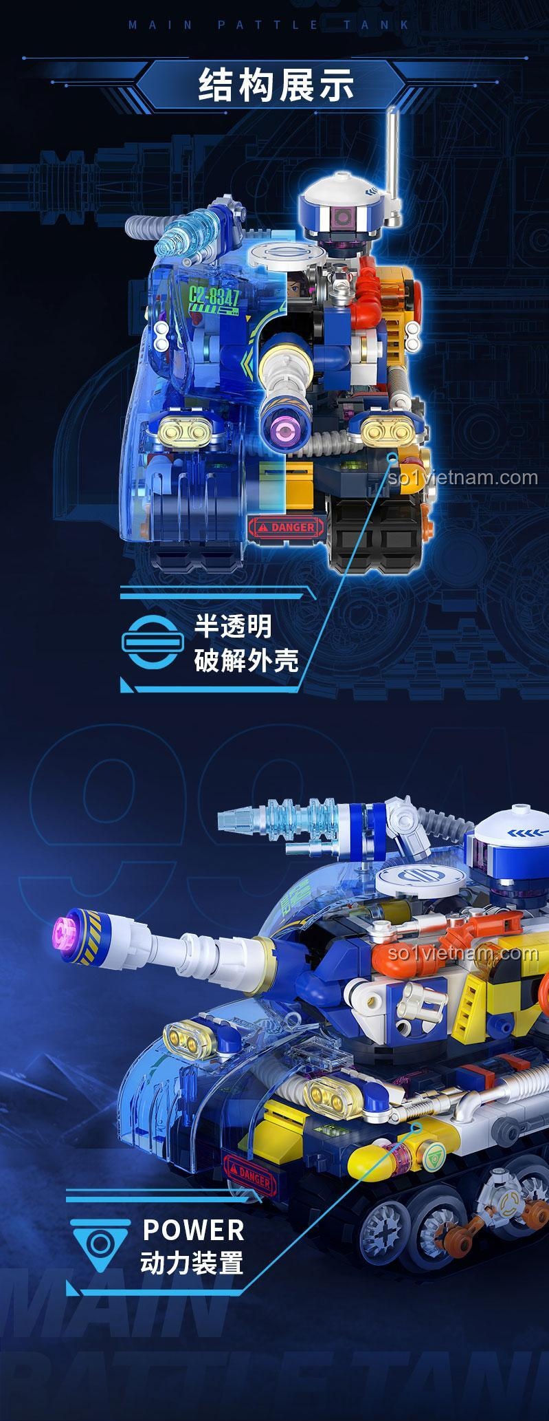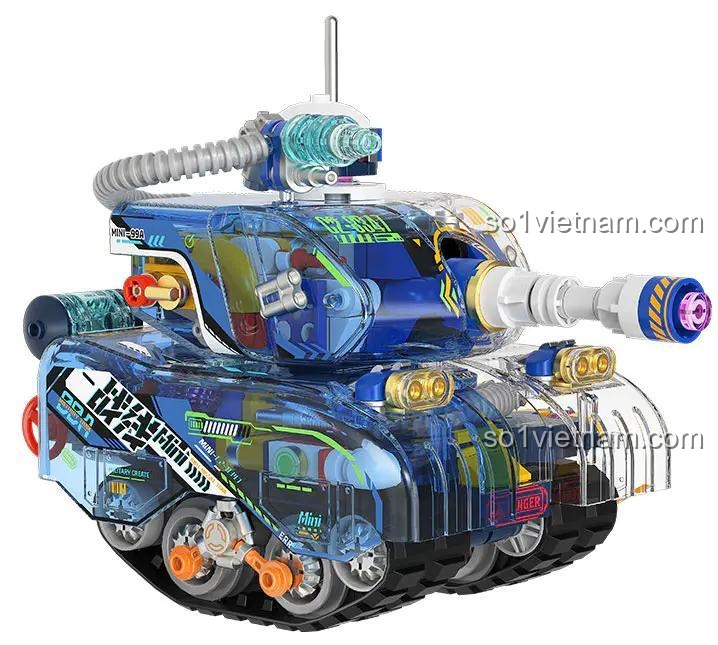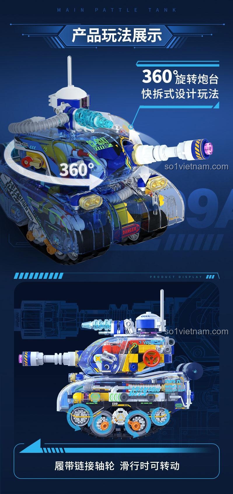 Bộ sản phẩm nổi bật với thiết kế nửa trong suốt, tháp pháo xoay 360 độ, bánh xích chuyển động và đi kèm minifigure pháo thủ.