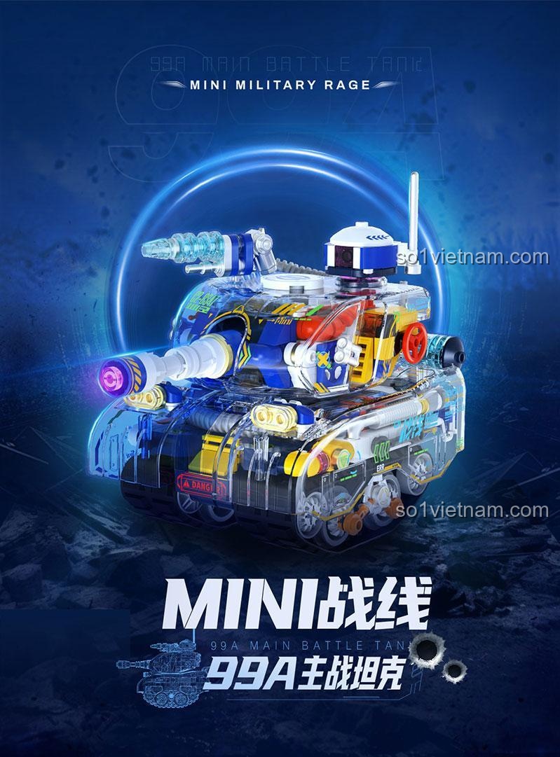 Điểm nhấn đặc biệt của bộ lắp ghép xe tăng 99A iBlock chính là thiết kế nửa trong suốt đầy sáng tạo. Bé có thể dễ dàng quan sát cấu trúc bên trong, từ động cơ mạnh mẽ đến hệ thống truyền động phức tạp, mang lại cảm giác thích thú và tò mò. Màu sắc chủ đạo xanh dương, vàng, trắng và đen kết hợp hài hòa, tạo nên vẻ ngoài mạnh mẽ, hiện đại nhưng không kém phần bắt mắt. Kích thước mô hình sau khi lắp ráp (17.4 x 9.9 x 13.6 cm) vừa vặn để bé trưng bày trên bàn học hoặc mang theo trong các cuộc phiêu lưu.