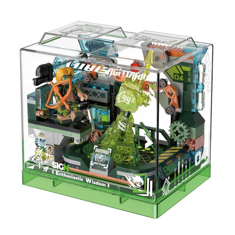 Ngay từ cái nhìn đầu tiên, đồ chơi mô hình iBlock đã gây ấn tượng mạnh mẽ bởi thiết kế độc đáo, khác biệt hoàn toàn so với các bộ xếp hình thông thường. Toàn bộ sa bàn chiến đấu được đặt gọn trong một chiếc hộp mica trong suốt, biến nó thành một vật phẩm trưng bày sang trọng và bắt mắt. Trung tâm của mô hình là minifigure Cung thủ Nhân Mã, được thiết kế cực ngầu với bộ giáp hiện đại, mái tóc vàng rực và khuôn mặt đầy quyết tâm. Tay cung thủ đang giương cây cung năng lượng, làm từ nhựa trong suốt màu xanh lá cây, tạo cảm giác như một luồng sức mạnh sắp được giải phóng. Xung quanh là một phòng điều khiển công nghệ cao với các màn hình, bảng mạch và bánh răng cơ khí, tất cả đều được in chi tiết sắc nét. Sự kết hợp giữa màu xanh lá neon, màu cam năng động và màu xám kim loại tạo nên một tổng thể hài hòa, đậm chất khoa học viễn tưởng. Đây chắc chắn là một tác phẩm nghệ thuật mà bất kỳ ai cũng phải trầm trồ.