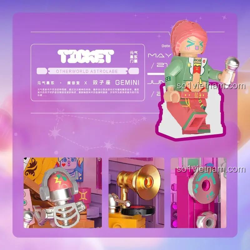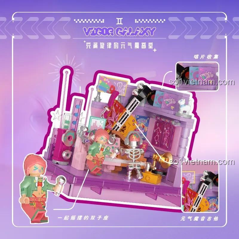Bộ sản phẩm còn đi kèm với 2 minifigures đáng yêu: một minifigure đại diện cho cung Song Tử nữ với phong cách cá tính và một minifigure robot Song Tử độc đáo. Các minifigures này không chỉ làm tăng thêm sự sinh động cho mô hình mà còn mở ra nhiều khả năng nhập vai và sáng tạo câu chuyện cho người chơi. Bên cạnh đó, các phụ kiện như micro, guitar điện, loa, máy hát đĩa than càng làm tăng thêm tính chân thực và hấp dẫn cho mô hình.