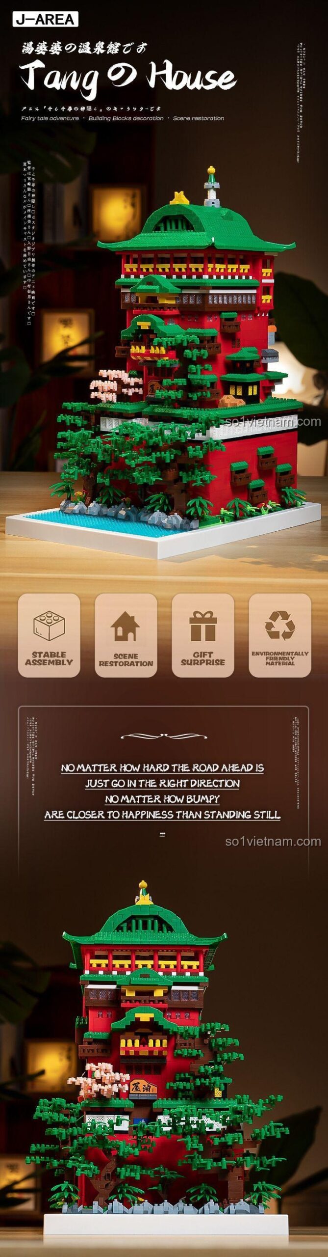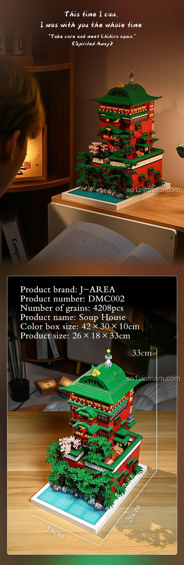 Bộ lắp ghép J-AREA DMC002 không chỉ là một món đồ chơi, mà còn là một tác phẩm nghệ thuật. Mỗi chi tiết đều được thiết kế để tái hiện chân thực kiến trúc độc đáo của Nhật Bản, từ những mái nhà cong vút, những bức tường gỗ đỏ son, đến những khu vườn xanh mướt và cây anh đào nở rộ. Mô hình cao 33cm, rộng 18cm và dài 26cm, với các chi tiết như khu vực tắm của khách, phòng nồi hơi, và sân trong, tất cả đều được mô phỏng một cách tinh xảo, mang đến cảm giác như bạn đang bước vào chính thế giới trong phim.