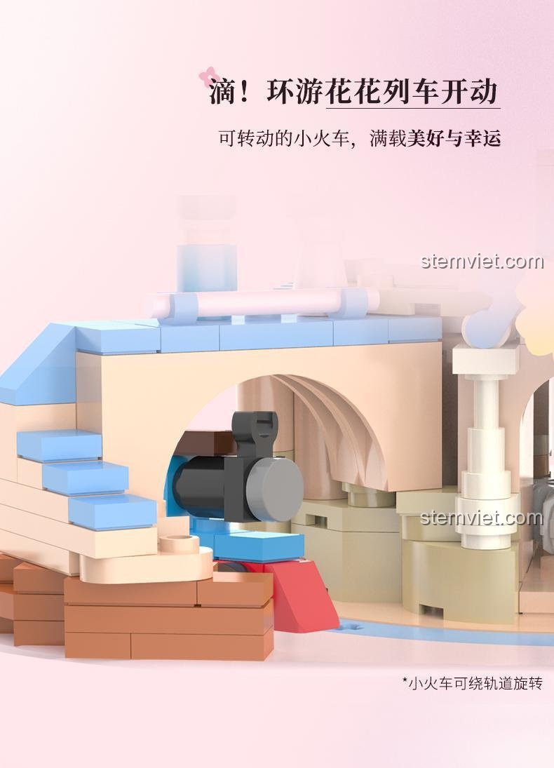 Ngoài tính năng phát nhạc và xoay, mô hình lâu đài phát nhạc JK1615 còn có chi tiết tàu hỏa nhỏ có thể di chuyển trên đường ray quanh lâu đài, tạo thêm sự sống động và tương tác cho bé khi chơi.
