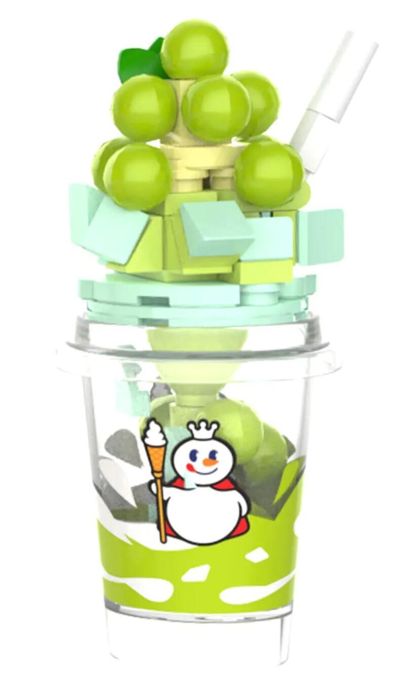 Chi tiết sống động: Bộ lắp ghép không chỉ tái hiện hình dáng bên ngoài của ly trà sữa mà còn chú trọng đến các chi tiết nhỏ bên trong. Hình ảnh chú người tuyết Snow King cầm ly kem, biểu tượng quen thuộc của Mixue, được đặt khéo léo bên trong ly trong suốt, tạo điểm nhấn đáng yêu và độc đáo. Những viên “mít tơ” màu xanh lá được xếp đầy trên mặt ly, cùng với ống hút trắng, tất cả đều góp phần tạo nên một mô hình đồ uống sống động như thật.