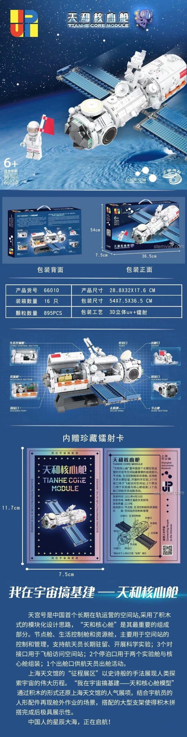 Đây là mô hình của khoang lõi Thiên Hòa, bộ phận trung tâm và quan trọng nhất của Trạm vũ trụ Thiên Cung do Trung Quốc xây dựng và vận hành ngoài không gian. Đây là một công trình khoa học có thật, giúp bé vừa chơi vừa có thêm kiến thức thực tế.