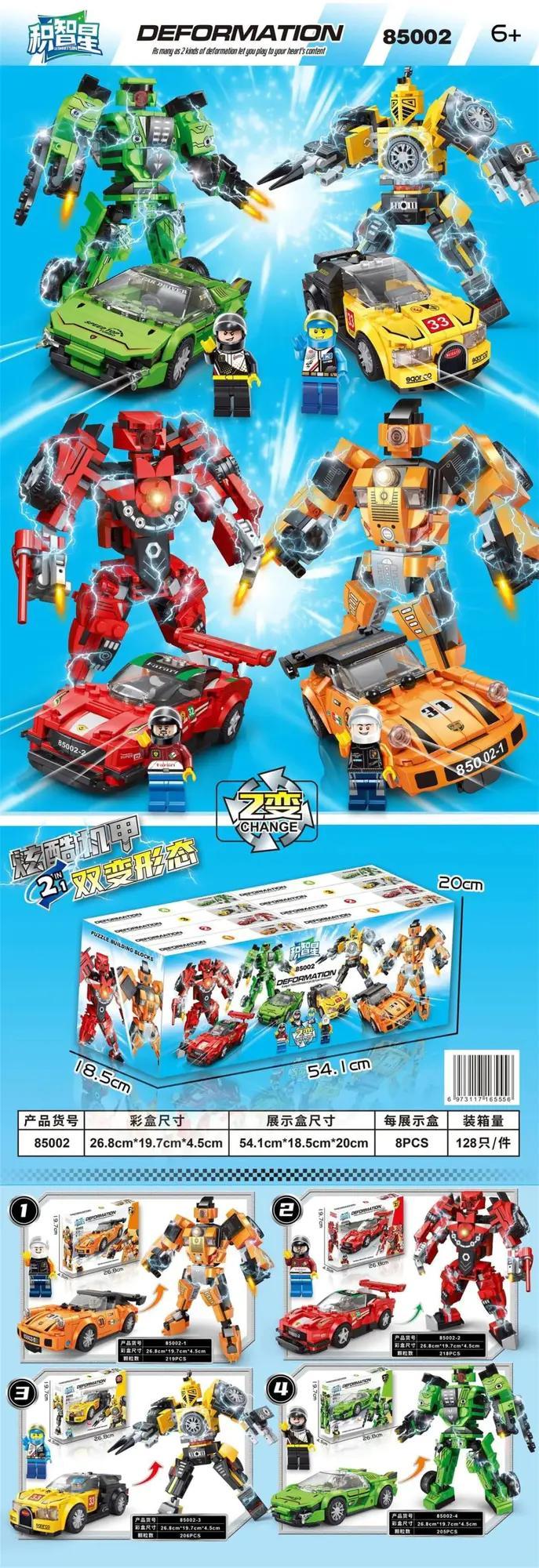 Bộ đồ chơi mô hình Siêu xe biến hình 002 này bao gồm 4 mẫu xe đua biến hình thành robot chiến đấu độc đáo, mỗi mẫu có màu sắc và thiết kế riêng biệt. Tổng cộng có 8 mẫu lắp được (4 xe và 4 robot).