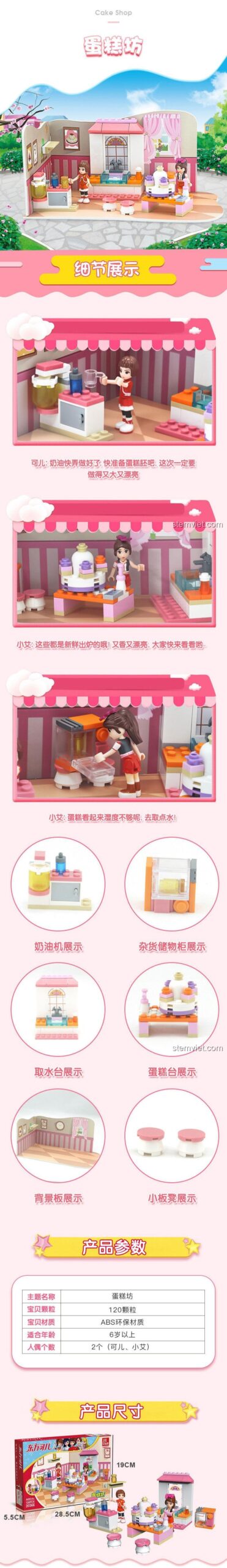 Chào mừng bạn đến với Thế Giới Bánh Ngọt đầy màu sắc cùng bộ lắp ghép JIESTAR 20366 Cửa Hàng Bánh Ngọt! Đây là món đồ chơi mơ ước dành cho mọi bé gái 6 tuổi yêu thích sự sáng tạo và những chiếc bánh ngọt xinh xắn. Với 120 mảnh ghép chất lượng cao, bộ đồ chơi này không chỉ mang đến những giờ phút giải trí bất tận mà còn giúp bé phát triển tư duy logic, sự khéo léo và trí tưởng tượng phong phú. Thiết kế dễ thương, màu sắc tươi sáng cùng 2 minifigure đáng yêu sẽ khiến bé mê mẩn ngay từ cái nhìn đầu tiên. Đặc biệt, sản phẩm có mức giá cực kỳ tiết kiệm, là lựa chọn thay thế đáng tiền cho các bộ LEGO® tương tự mà vẫn đảm bảo chất lượng và độ bền vượt trội. Tương thích hoàn hảo với các khối LEGO® tiêu chuẩn, bé có thể thỏa sức kết hợp và mở rộng thế giới đồ chơi của mình. Hãy sở hữu ngay bộ lắp ghép Cửa Hàng Bánh Ngọt JIESTAR 20366 để bé yêu thỏa sức sáng tạo và khám phá niềm vui làm bánh!