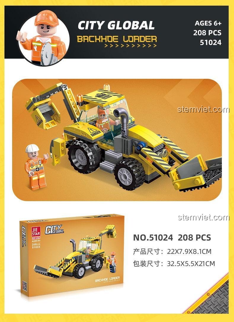 Ngay từ cái nhìn đầu tiên, Xe Công Trình 51024 đã thu hút mọi ánh nhìn với tông màu vàng-đen đặc trưng của các dòng xe xây dựng, mạnh mẽ và đầy chuyên nghiệp. Từng chi tiết, từ cabin rộng rãi cho bác tài xế minifigure, hệ thống ống xả, đèn cảnh báo trên nóc, cho đến bộ lốp cao su gai góc, đều được tái hiện một cách tỉ mỉ, chân thực. Điểm nhấn đặc biệt và đáng giá nhất của mô hình này chính là thiết kế 2 trong 1 cực kỳ thông minh. Phía trước là gầu xúc lớn, vững chãi, sẵn sàng san lấp mặt bằng hoặc xúc vật liệu. Phía sau là cánh tay đào đa khớp nối linh hoạt, có thể vươn dài, xoay và múc sâu, mô phỏng hoàn hảo chức năng của một chiếc máy xúc đào thực thụ. Với kích thước sau lắp ráp là 22 x 7.9 x 8.1 cm, đây là một mô hình vừa vặn, hoàn hảo để bé trưng bày trong phòng hoặc mang theo trong những cuộc phiêu lưu tưởng tượng của mình.