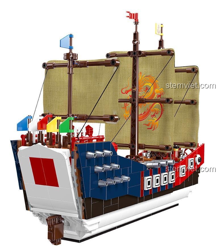 Ngay từ cái nhìn đầu tiên, đồ chơi mô hình JIESTAR 58001 đã gây ấn tượng mạnh mẽ bởi thiết kế cổ điển, oai phong và đầy chi tiết. Với chiều dài lên tới 37cm, đây là một mô hình hoành tráng, đủ sức trở thành tâm điểm trong bất kỳ bộ sưu tập nào. Thân tàu kết hợp hài hòa giữa các màu sắc chủ đạo như Nâu gỗ trầm ấm, Đỏ uy quyền, Xanh dương của biển cả và Trắng tinh khôi, tạo nên một tổng thể vừa bắt mắt vừa chân thực. Điểm nhấn đặc biệt nhất chính là ba cánh buồm lớn làm từ vải, với cánh buồm trung tâm được in hình rồng vàng đầy quyền lực, uốn lượn như đang bay trên sóng nước. Từng chi tiết nhỏ như mỏ neo, bánh lái, lan can, cột buồm và đặc biệt là dàn pháo hùng hậu hai bên mạn thuyền đều được chăm chút tỉ mỉ, mang lại một vẻ đẹp tinh xảo và sống động. Mô hình này không chỉ để chơi, mà còn là một tác phẩm nghệ thuật để trưng bày, thể hiện gu thẩm mỹ và niềm đam mê của người sở hữu.