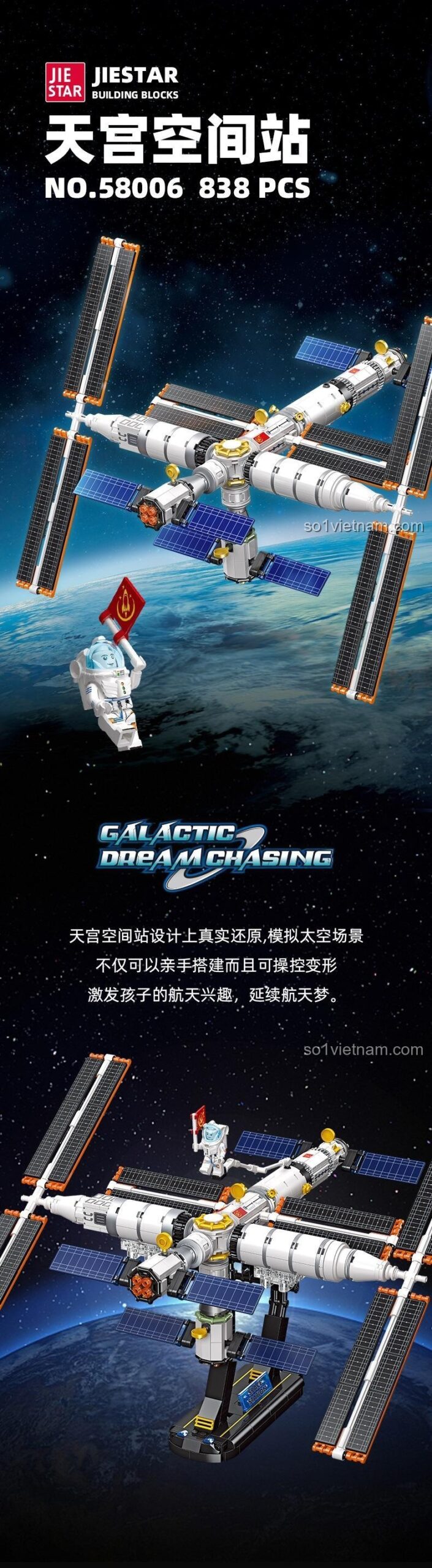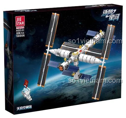 Mẹ có biết không, trong tâm trí của mỗi cậu bé 6 tuổi luôn ẩn chứa một giấc mơ lớn lao: trở thành phi hành gia, bay vào không gian và khám phá những vì sao xa xôi. Đó là khát vọng được chạm tới những điều vĩ đại, được tìm hiểu về vũ trụ bao la. Lấy cảm hứng từ thành tựu không gian đáng tự hào của con người, **bộ lắp ghép Trạm Vũ trụ Thiên Cung Jiestar 58006** ra đời để biến giấc mơ đó trở nên gần gũi hơn bao giờ hết. Sản phẩm này không chỉ là một món đồ chơi, mà là một câu chuyện về khát vọng chinh phục. Nó tái hiện lại Trạm vũ trụ Thiên Cung – “Cung điện trên trời” có thật, một biểu tượng cho thấy trí tuệ và nỗ lực của con người có thể vươn xa đến đâu. Khi bé lắp ráp từng mảnh ghép, bé không chỉ xây dựng một mô hình, mà còn đang tiếp nối một di sản của sự khám phá, khơi dậy niềm đam mê khoa học và nuôi dưỡng một ước mơ lớn cho tương lai. Đây chính là món quà ý nghĩa, giúp bé hiểu rằng mọi công trình vĩ đại đều bắt đầu từ những viên gạch nhỏ nhất.