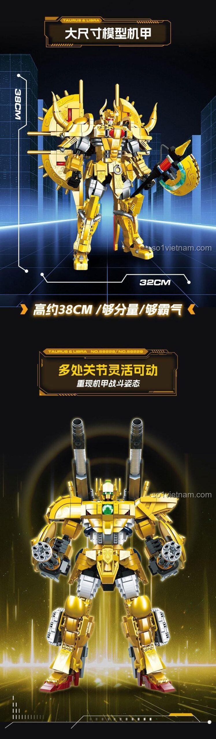 Hỡi các chàng trai 14 tuổi, những người đã từng say mê câu chuyện về các Thánh Đấu Sĩ bảo vệ nữ thần Athena, bạn đã sẵn sàng cho một huyền thoại tái sinh chưa? Hãy quên đi những mô hình tĩnh nhàm chán, JIESTAR 58228 mang đến một phiên bản hoàn toàn mới: Robot Mecha Thánh Đấu Sĩ Kim Ngưu! Lấy cảm hứng từ Taurus Aldebaran, một trong 12 Thánh Đấu Sĩ Vàng mạnh mẽ nhất, bộ lắp ráp này không chỉ tái hiện lại hình ảnh người bảo vệ Cung Kim Ngưu mà còn nâng tầm sức mạnh đó lên một đẳng cấp cơ giới hóa, hiện đại và cực ngầu. Đây là cơ hội để bạn tự tay xây dựng nên một biểu tượng của sức mạnh, lòng trung thành và sự bất khuất, một câu chuyện tuổi thơ được kể lại qua từng mảnh ghép đầy sáng tạo.