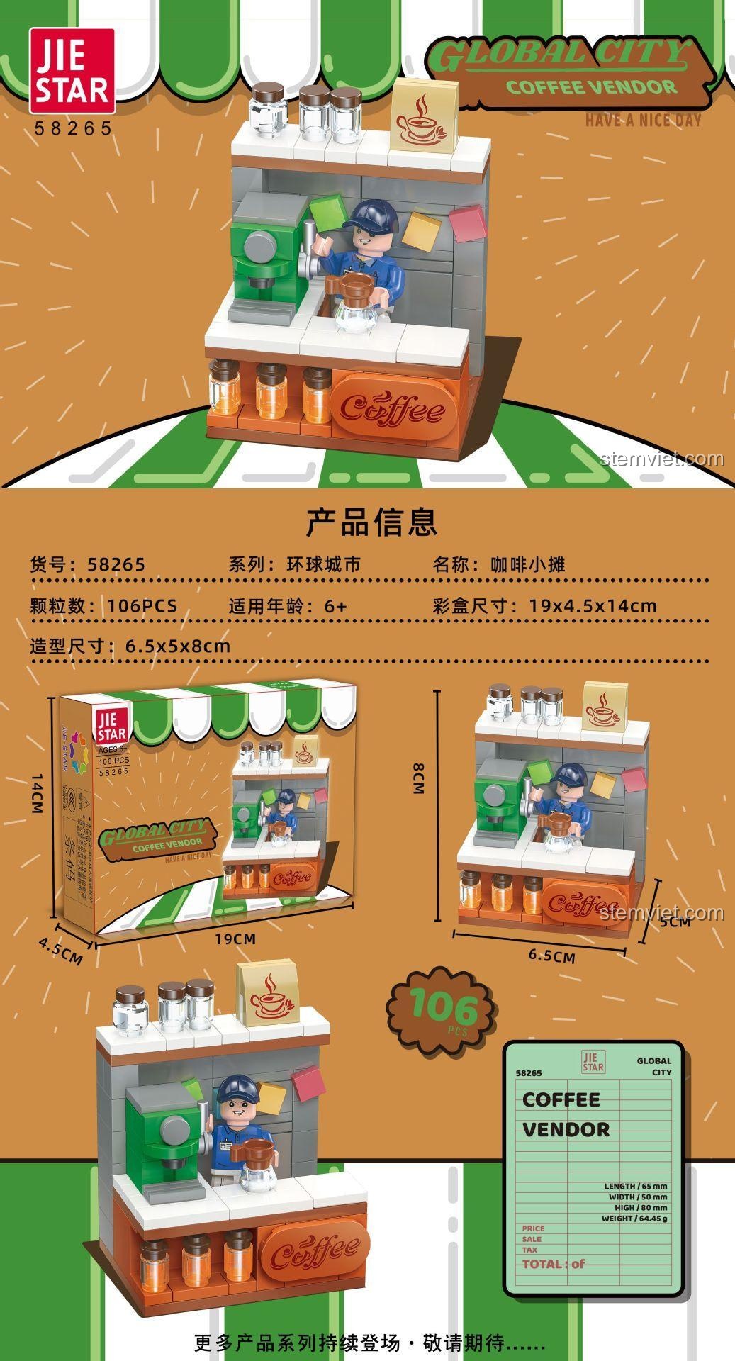 Ngay từ cái nhìn đầu tiên, mẹ và bé sẽ bị chinh phục bởi sự chi tiết và màu sắc hài hòa của bộ lắp ráp JIESTAR 58265. Với tông màu chủ đạo là nâu gỗ ấm cúng, kết hợp với màu xanh lá tươi mát của máy pha chế và mái hiên, mô hình mang lại cảm giác vừa cổ điển vừa hiện đại. Từng chi tiết nhỏ nhất đều được chăm chút tỉ mỉ: từ chiếc máy pha cà phê trông như thật, những lọ thủy tinh đựng hạt cà phê, chiếc bình pha pour-over, cho đến tấm biển hiệu ‘Coffee’ đầy phong cách. Với kích thước nhỏ gọn 6.5 x 5 x 8 cm, quầy cà phê này có thể dễ dàng trở thành một điểm nhấn đáng yêu trong thành phố LEGO® mà bé đang xây dựng. Minifigure nhân viên pha chế với nụ cười thân thiện và bộ đồng phục chuyên nghiệp càng làm cho mô hình thêm sống động. Tất cả 106 mảnh ghép đều được thiết kế để tạo nên một tổng thể hoàn hảo, một tác phẩm nghệ thuật thu nhỏ mà bé có thể tự hào trưng bày sau khi hoàn thành.