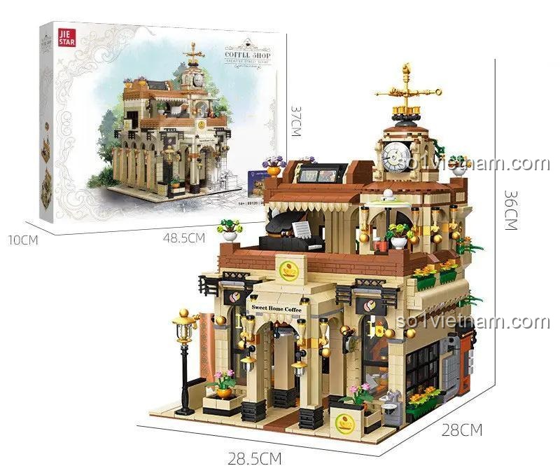 Sau khi lắp ráp hoàn chỉnh, mô hình Quán Cà Phê Cổ Điển sẽ có kích thước là 28.5 cm (dài) x 28 cm (rộng) x 36 cm (cao). Đây là một kích thước lý tưởng để trưng bày trên kệ sách, bàn làm việc hoặc trong tủ kính.