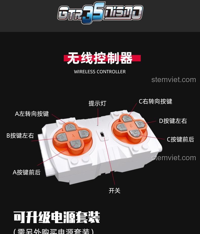 Bộ sản phẩm được thiết kế sẵn không gian để lắp đặt bộ động cơ và điều khiển từ xa (bán riêng). Bạn chỉ cần mua đúng bộ Power Functions tương thích và làm theo hướng dẫn để biến chiếc xe của mình thành phiên bản điều khiển từ xa.