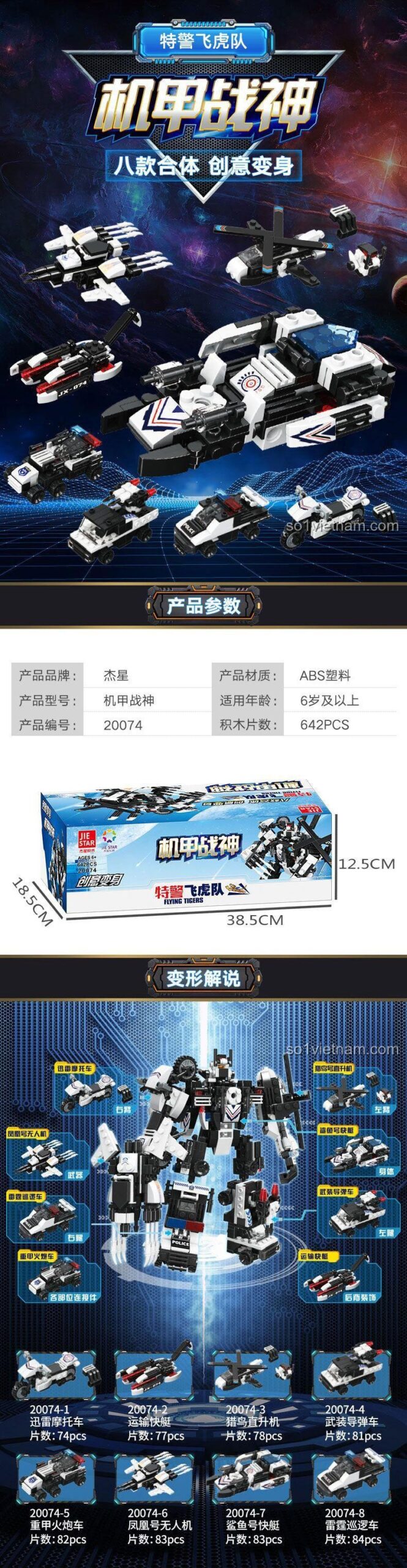 Bộ JIESTAR 20074 cho phép bé lắp ráp thành 8 mẫu khác nhau, bao gồm các loại xe cảnh sát, máy bay chiến đấu, robot và xe quân sự.