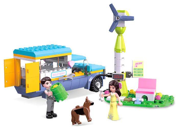 Điểm nhấn đặc biệt của bộ lắp ghép này là mô hình tua-bin gió có cánh quạt quay được, mang đến yếu tố năng lượng tái tạo và sự độc đáo cho mô hình. Bên cạnh đó, bộ sản phẩm còn bao gồm một bệ cảnh quan nhỏ xinh với ghế màu hồng, cây xanh và hoa, tạo nên một khung cảnh sống động cho câu chuyện của bé. Bé có thể thỏa sức sáng tạo với các minifigure đi kèm: một bé trai đang khuân thùng hàng và một bé gái cùng chú chó trung thành, tạo nên những kịch bản giao hàng và chăm sóc thú cưng đầy ý nghĩa.