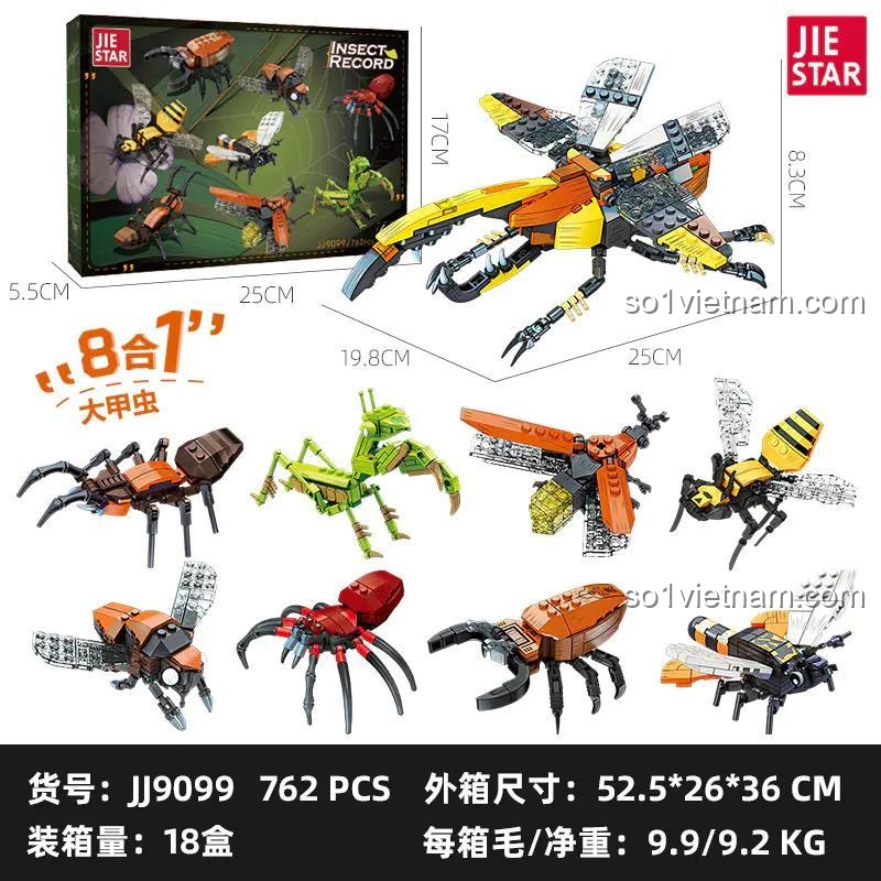Bộ JIESTAR JJ9099 có khả năng lắp ráp 8 trong 1, cho phép bé tạo ra 8 mô hình côn trùng khác nhau.
