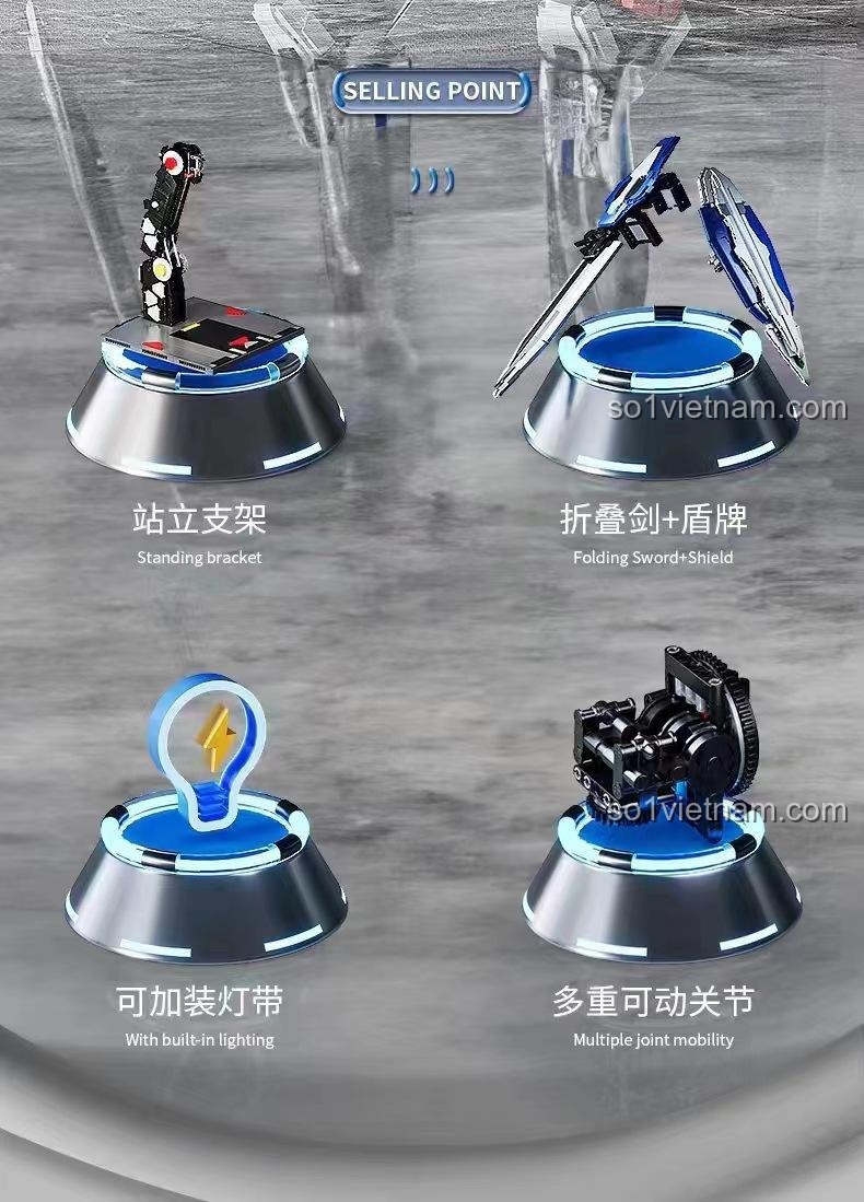 Mô hình DJ-Rambo 001 nổi bật với hệ thống đèn LED chiếu sáng ấn tượng, các khớp nối linh hoạt cho phép tạo nhiều tư thế, cùng với kiếm và khiên đi kèm. Ngoài ra, nó còn có chân đế trưng bày chuyên nghiệp.