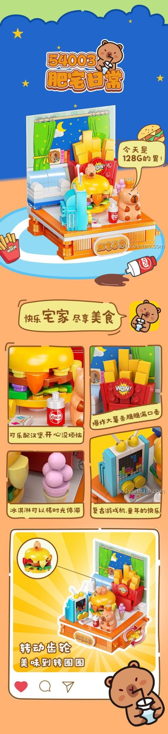 Không chỉ dừng lại ở việc lắp ráp tĩnh, bộ lắp ghép Kalos Blocks 54003 còn mang đến những tính năng đặc biệt vô cùng thú vị. Điểm nhấn chính là “Cơ chế liên kết cảnh quan” và “Cơ chế bánh răng xoay” độc đáo. Bé có thể lắp ráp và kết nối các cảnh Capybara khác nhau lại với nhau, sau đó sử dụng bánh răng để tạo ra chuyển động tương tác, khiến các chi tiết trong mô hình xoay tròn hoặc di chuyển một cách sống động. Ví dụ, chiếc burger hay khoai tây chiên có thể xoay vòng, tạo cảm giác như Capybara đang thưởng thức bữa ăn ngon lành. Khả năng lắp ghép 8 mẫu khác nhau trong cùng một bộ sản phẩm cũng là một tính năng đặc biệt, khuyến khích bé khám phá và sáng tạo không ngừng. Những tính năng này không chỉ tăng thêm niềm vui khi chơi mà còn giúp bé hiểu hơn về các nguyên lý cơ học đơn giản, phát triển tư duy hệ thống và khả năng giải quyết vấn đề.