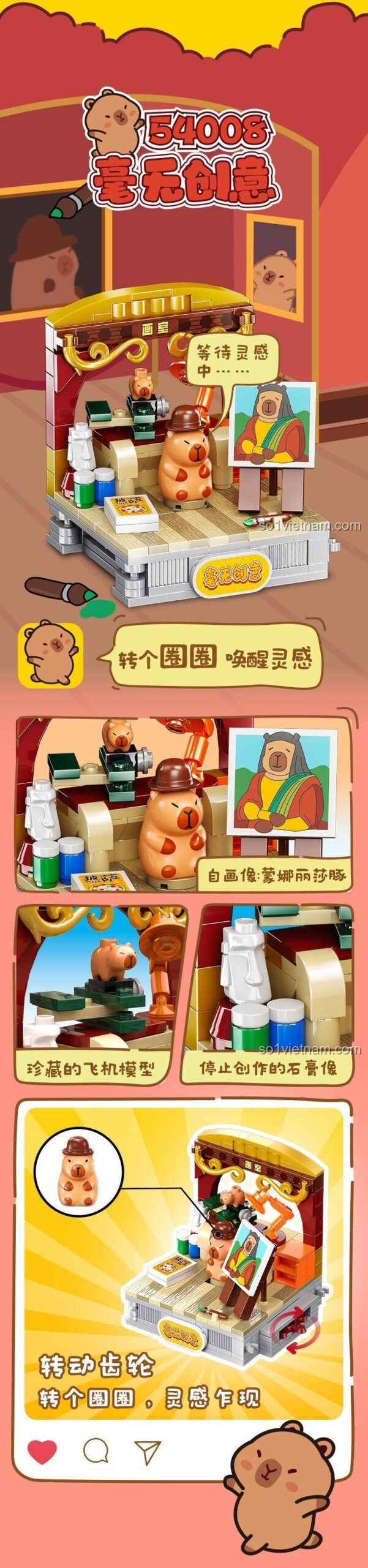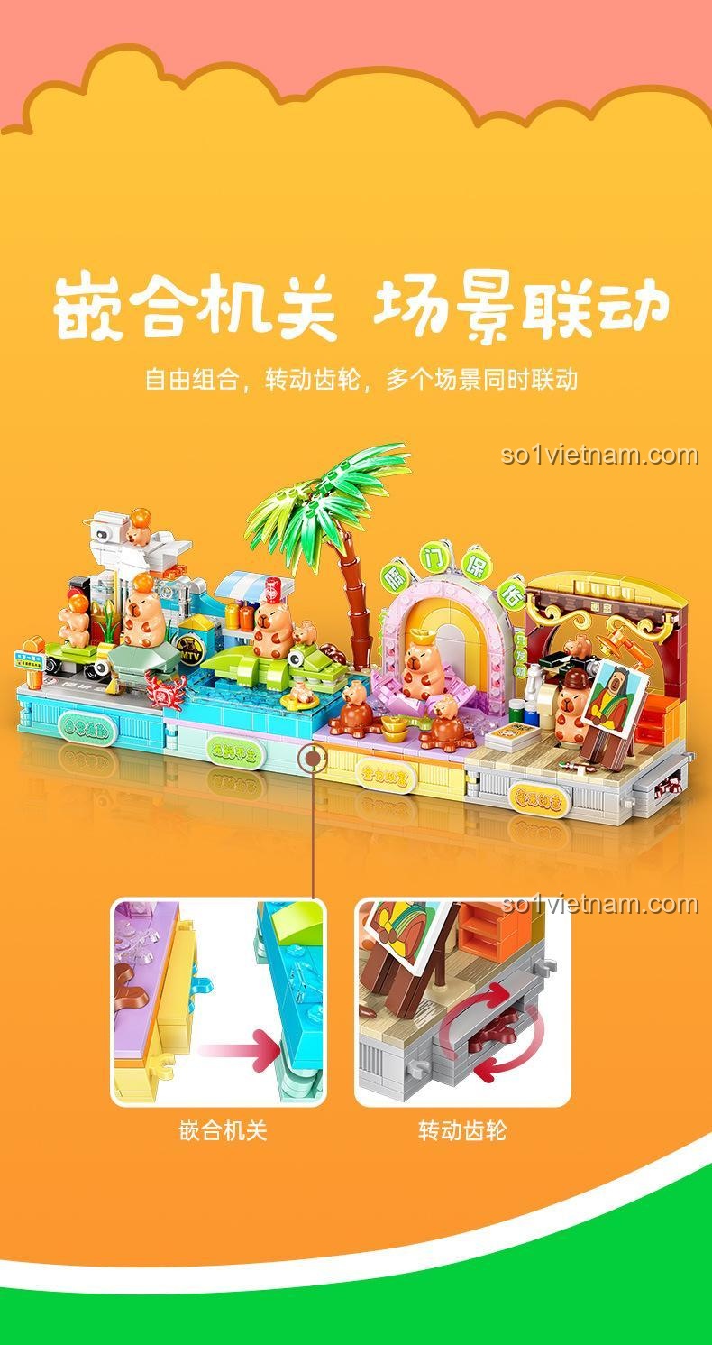 Ngoài việc lắp ráp, bộ đồ chơi mô hình này còn có “Cơ chế liên kết cảnh quan” và “Cơ chế bánh răng xoay” độc đáo. Bé có thể kết nối các cảnh và tạo ra chuyển động tương tác, làm cho mô hình Capybara chơi game 3 trở nên sống động hơn.