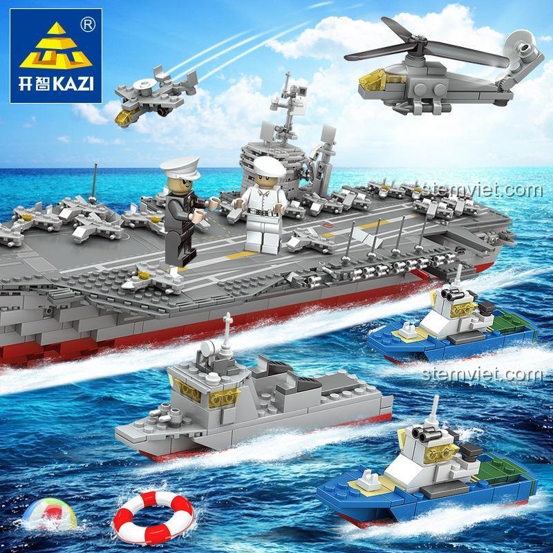 Bộ sản phẩm rất đầy đủ, ngoài tàu sân bay chính, bé còn nhận được nhiều máy bay chiến đấu, trực thăng, các tàu hộ tống nhỏ và 2 minifigure để tạo nên một sa bàn hải quân hoàn chỉnh.