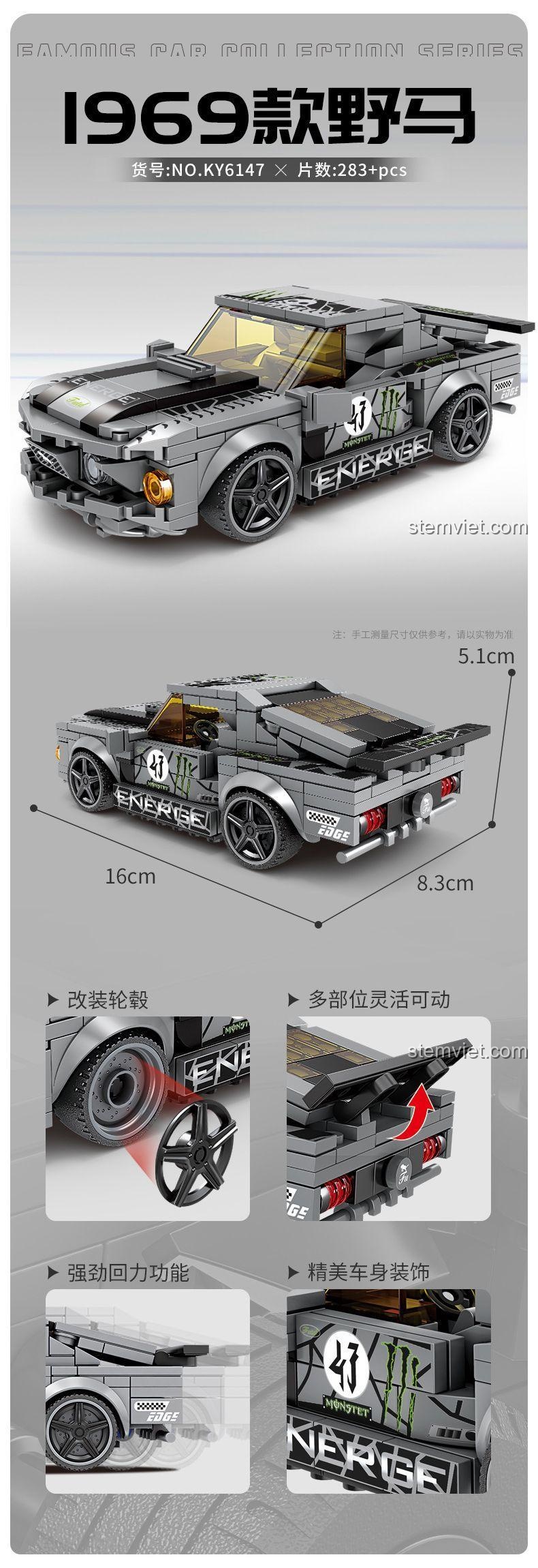 Điểm nhấn của bộ đồ chơi KY6147 chính là động cơ kéo lùi mạnh mẽ. Chỉ cần kéo lùi xe và thả ra, chiếc Mustang sẽ lao vút về phía trước với tốc độ ấn tượng, mang lại những giờ phút vui chơi đầy phấn khích cho bé. Không chỉ vậy, mô hình còn có nhiều tính năng đặc biệt khác: bánh xe có thể thay đổi, cho phép bé tùy chỉnh diện mạo chiếc xe theo ý thích; nhiều vị trí trên xe linh hoạt có thể di chuyển, tăng cường tính tương tác; và những chi tiết trang trí thân xe đẹp mắt, làm nổi bật vẻ ngoài thể thao của chiếc Xe Mustang 1969 KAZI. Với 283 mảnh ghép, bé sẽ được thử thách và thỏa sức sáng tạo.