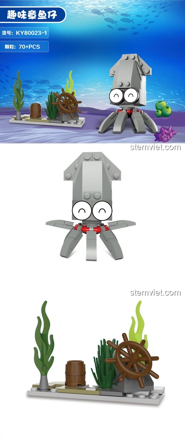 Điểm thu hút đầu tiên của đồ chơi mô hình KY80023-1 chính là thiết kế vô cùng dễ thương. Chú bạch tuộc được tạo hình với thân hình tròn trịa, màu xám trang nhã, điểm xuyết bằng các khớp nối màu đỏ nổi bật, tạo nên một tổng thể hài hòa và bắt mắt. Đặc biệt nhất chính là đôi mắt to tròn, long lanh có thể xoay được, cho phép bé thay đổi biểu cảm của chú bạch tuộc từ vui vẻ, ngạc nhiên đến tò mò, tinh nghịch. Chỉ một chi tiết nhỏ nhưng lại mở ra vô vàn khả năng sáng tạo kịch bản cho bé. Với 70 mảnh ghép được chế tác tỉ mỉ, các góc cạnh bo tròn, bé sẽ lắp ráp nên một mô hình vững chắc, đáng yêu. Bên cạnh đó, bộ sản phẩm còn đi kèm một cụm cảnh quan nhỏ với rong rêu và bánh lái tàu cũ, giúp bé xây dựng một không gian đại dương thu nhỏ cho riêng mình.