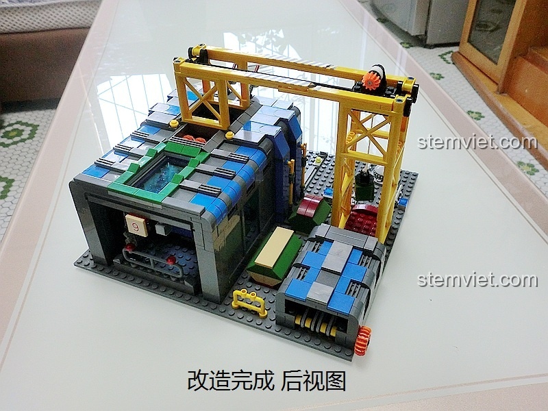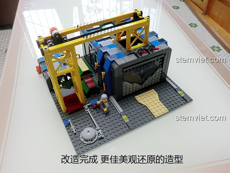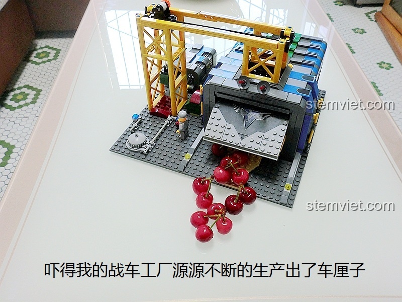 • Điều khiển cần cẩu: Bé có thể tự tay di chuyển cần cẩu dọc theo nhà máy, dùng móc để “nâng” các bộ phận của xe, mô phỏng công đoạn lắp ráp một cỗ máy chiến tranh.