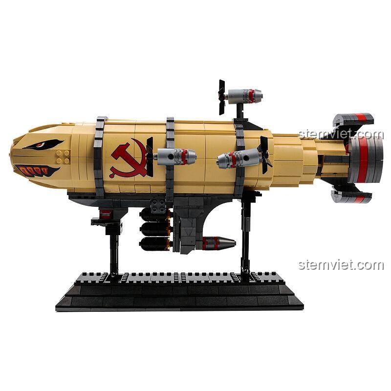 Ngay từ cái nhìn đầu tiên, mô hình Phi thuyền Kirov KAZI đã gây ấn tượng mạnh mẽ bởi sự trung thành với thiết kế gốc trong game Red Alert. Toàn bộ thân phi thuyền được bao phủ bởi màu vàng cát đặc trưng, kết hợp với các chi tiết màu đen và xám tạo nên một tổng thể hài hòa nhưng không kém phần uy lực. Điểm nhấn không thể bỏ qua chính là phần đầu phi thuyền với hàm răng cá mập được in sắc nét, đôi mắt đỏ ngầu đầy vẻ hiếu chiến, tái hiện hoàn hảo vẻ ngoài hung hãn của ‘Tử Thần Bầu Trời’. Biểu tượng búa liềm màu đỏ nổi bật trên thân càng khẳng định ‘quốc tịch’ Liên Xô của cỗ máy chiến tranh này. Với 795 mảnh ghép, mô hình không chỉ lớn về kích thước mà còn tinh xảo trong từng chi tiết, từ các động cơ đẩy phía sau, các cánh quạt cho đến khoang chứa bom bên dưới. Tất cả tạo nên một mô hình trưng bày cực ‘chất’, một món đồ chơi mà bất kỳ bé trai nào cũng phải trầm trồ.