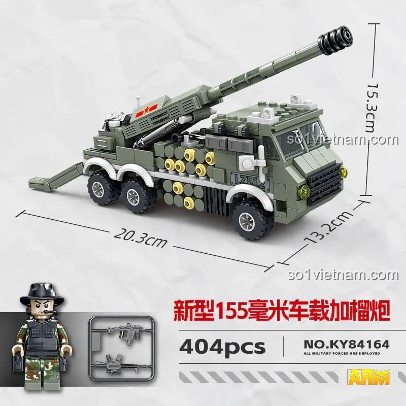 Bộ lắp ráp KAZI KY84164 nổi bật với thiết kế mô phỏng chân thực xe pháo tự hành 155mm. Với 404 chi tiết, bé có thể tự tay xây dựng nên một mô hình có kích thước ấn tượng: dài 20.3cm, rộng 13.2cm và cao 15.3cm. Màu sắc chủ đạo xanh lá, đen và trắng tạo nên vẻ ngoài mạnh mẽ, uy nghiêm đúng chất quân sự.