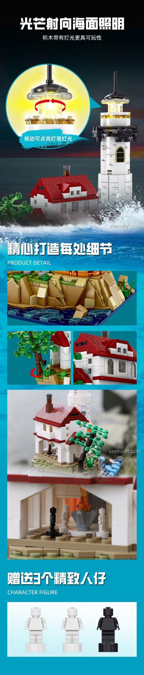 Ngoài tháp hải đăng là trung tâm, bộ sản phẩm còn bao gồm một ngôi nhà của người gác đèn rất xinh xắn, một cái cây, phần mỏm đá và mặt biển xanh. Đặc biệt, bộ đồ chơi còn tặng kèm 3 nhân vật minifigure để bé có thể sáng tạo nên những câu chuyện và kịch bản chơi phong phú hơn.