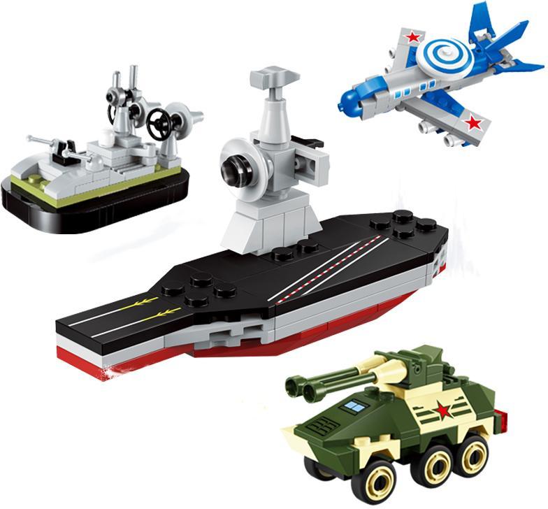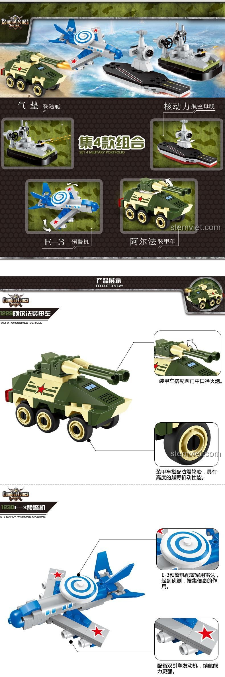 Bộ KEEPPLEY 1232 cho phép bé lắp ráp thành 4 mẫu mô hình quân sự khác nhau: Xe tăng Alpha, Máy bay E-3, Tàu sân bay hạt nhân và Tàu đổ bộ khí đệm.