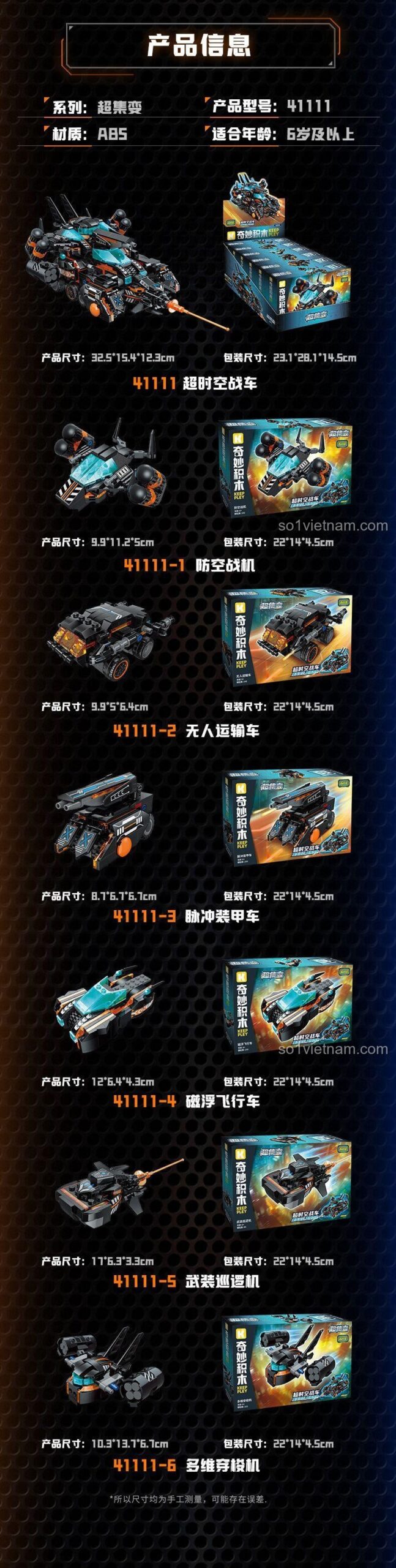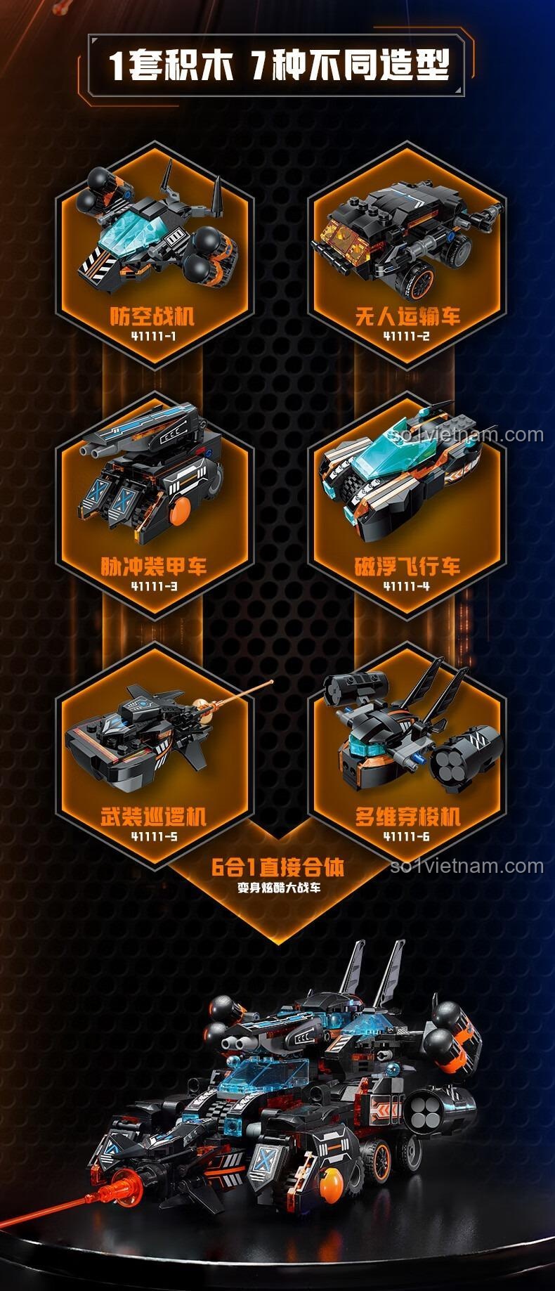 Bộ Keeppley 41111 cho phép bé lắp ráp 6 mẫu phương tiện khác nhau: Máy bay phòng không, Xe vận tải không người lái, Xe bọc thép xung lực, Xe bay từ tính, Máy bay tuần tra vũ trang, Máy bay xuyên không gian. Bé cũng có thể kết hợp chúng lại thành một robot khổng lồ.
