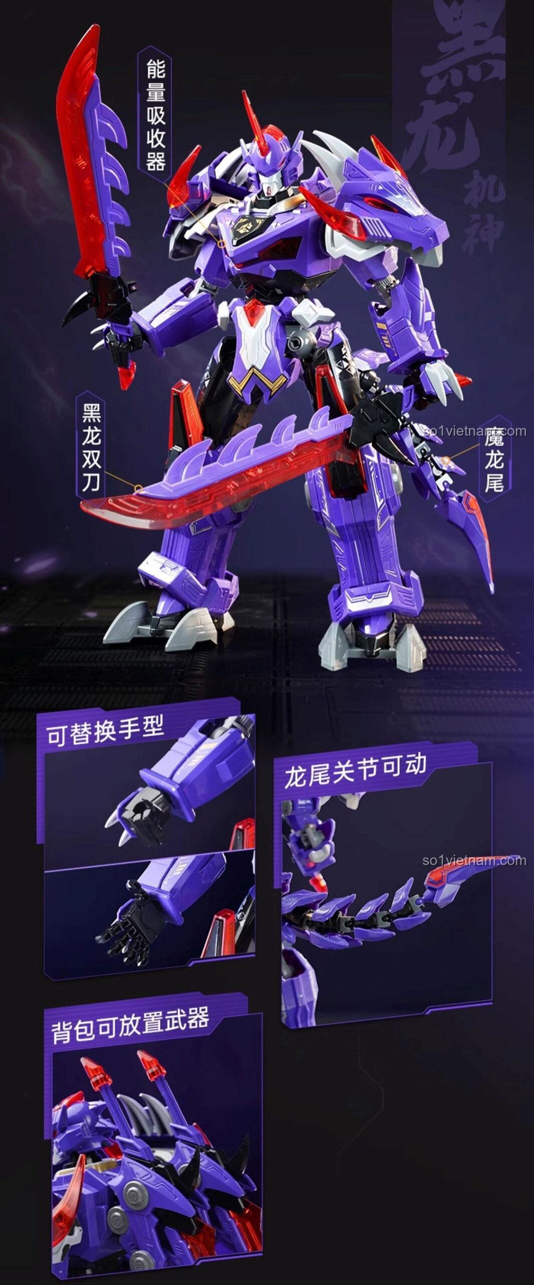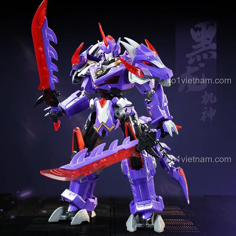 Hắc Long Cơ Thần Keeppley 81011 sở hữu một thiết kế vô cùng ấn tượng và chi tiết. Với tông màu tím chủ đạo, điểm xuyết bởi sắc đỏ rực lửa và trắng tinh khôi, cùng các chi tiết màu đen mạnh mẽ, mô hình toát lên vẻ uy quyền và bí ẩn. Tỉ lệ mô hình được thiết kế cân đối, với chiều cao 26.3 cm, chiều rộng 16.7 cm và chiều sâu 23.6 cm, tạo nên một hình ảnh Hắc Long Cơ Thần đầy sức sống và mạnh mẽ. Các chi tiết trên giáp, từ đầu rồng uy dũng đến đuôi rồng linh hoạt, đều được gia công tỉ mỉ, sắc nét, thể hiện sự chăm chút của nhà sản xuất Keeppley. Đặc biệt, các khớp nối linh hoạt cho phép mô hình dễ dàng tạo ra nhiều tư thế chiến đấu đa dạng, từ tấn công mạnh mẽ đến phòng thủ vững chắc, mang đến trải nghiệm thị giác mãn nhãn cho người chơi.