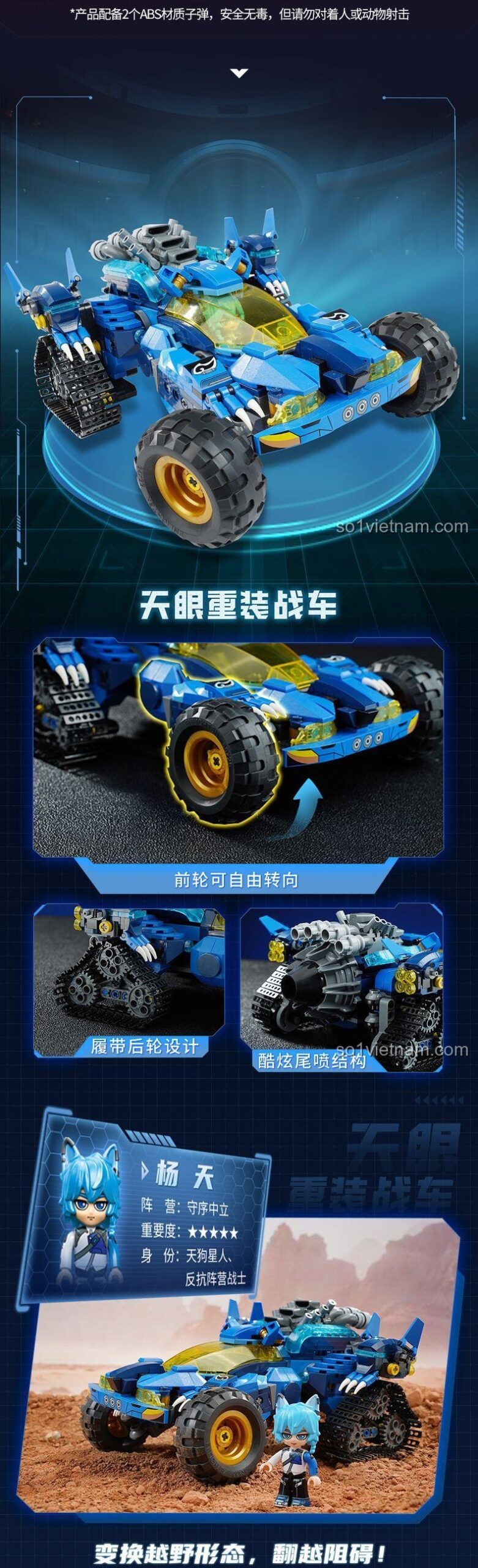 Thiên Nhãn Trọng Trang Chiến Xa Keeppley 81017 nổi bật với thiết kế hầm hố, mạnh mẽ, lấy cảm hứng trực tiếp từ bộ phim “Ngân Hà Phong Thần Ký”. Mô hình sở hữu tông màu xanh dương chủ đạo, điểm xuyết sắc vàng và đen tạo nên vẻ ngoài ấn tượng và thu hút. Từng chi tiết nhỏ đều được chăm chút tỉ mỉ, từ hệ thống bánh xe có thể xoay linh hoạt, bánh xích chuyển động mạnh mẽ cho đến cấu trúc đuôi có thể mở rộng, tất cả đều tái hiện chân thực hình ảnh chiếc xe chiến trong phim.
