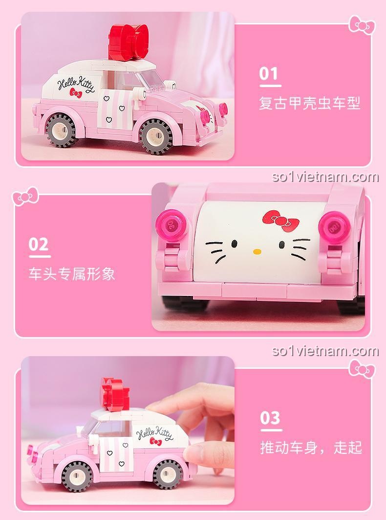 Điểm nhấn đặc biệt của bộ lắp ghép này là thiết kế mang đậm phong cách retro, màu sắc tươi sáng và chiếc nơ đỏ khổng lồ, tạo nên một vẻ ngoài vô cùng đáng yêu và độc đáo, khác biệt so với các mô hình Hello Kitty thông thường.