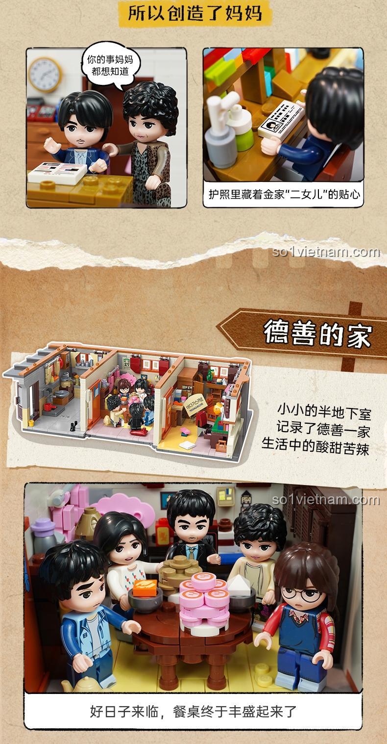 Điều làm nên linh hồn của Nhà của Deok-sun Keeppley chính là 5 minifigure độc quyền, tái hiện lại toàn bộ thành viên gia đình họ Sung. Bạn sẽ gặp lại ông bố Sung Dong-il hài hước, bà mẹ Lee Il-hwa hiền hậu, chị cả Sung Bo-ra “bà chằn” nhưng tình cảm, cô nàng nữ chính Sung Deok-sun tinh nghịch và cậu em út Sung No-eul “già trước tuổi”. Mỗi nhân vật đều được thiết kế với trang phục và biểu cảm đặc trưng, giúp bạn dễ dàng tái hiện lại những phân cảnh kinh điển trong phim. Hãy thử sắp đặt một bữa tối gia đình, một cuộc cãi vã của hai chị em, hay khoảnh khắc cả nhà cùng xem TV. Trí tưởng tượng của bạn là giới hạn duy nhất!