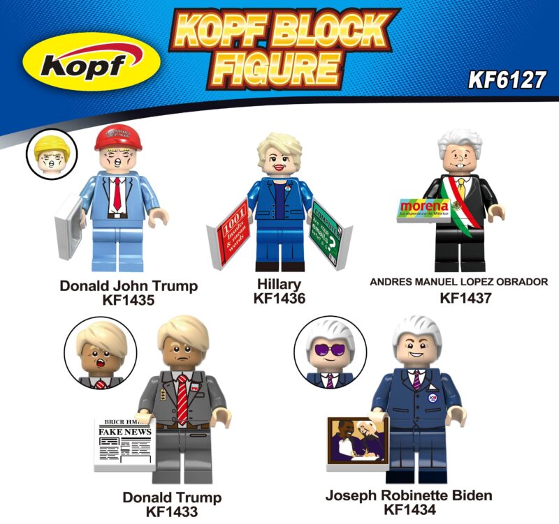 Bộ đồ chơi Minifigure Donald Trump Kopf bao gồm 5 minifigure chính trị gia nổi tiếng: Donald John Trump, Hillary, Andres Manuel Lopez Obrador, một phiên bản khác của Donald Trump và Joseph Robinette Biden. Mỗi nhân vật đều có phụ kiện đặc trưng đi kèm.