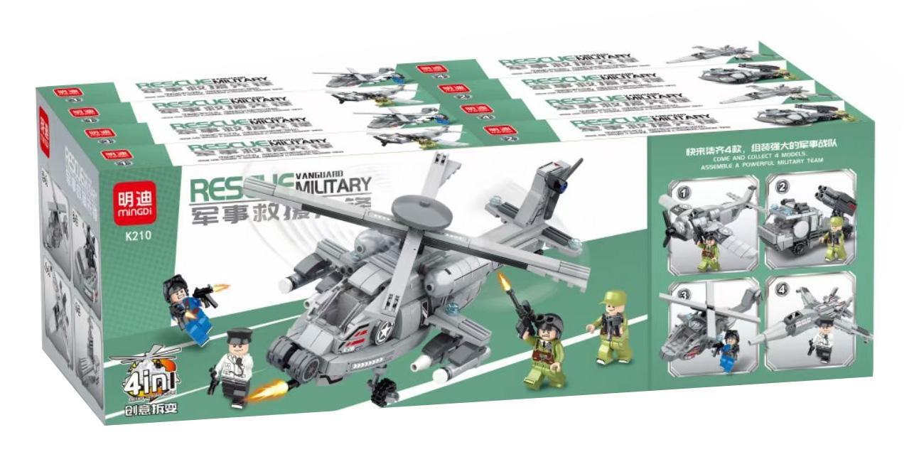 Đây chính là điểm đặc biệt của bộ đồ chơi minGDi K210 Tiên Phong Cứu Hộ Quân Sự! Với thiết kế 4 trong 1, bé có thể lắp ráp thành 4 mẫu phương tiện quân sự khác nhau: máy bay trực thăng, xe bọc thép, máy bay chiến đấu và máy bay trinh sát. Điều này giúp tăng cường sự sáng tạo và giá trị chơi của sản phẩm.
