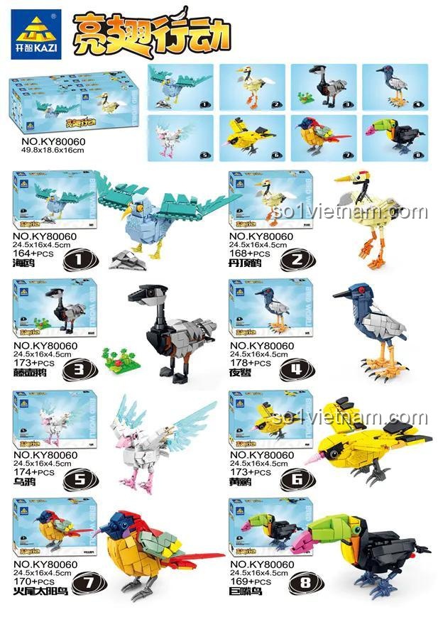 Bộ xếp hình KAZI KY80060 này cho phép bé lắp ráp được 8 mô hình chim khác nhau, bao gồm Hải Âu, Sếu Đầu Đỏ, Ngỗng Biển, Diệc Đêm, Quạ, Hoàng Yến, Chim Hút Mật Lửa và Toucan. Ngoài ra, bé có thể tự do sáng tạo thêm nhiều mẫu khác theo trí tưởng tượng của mình.