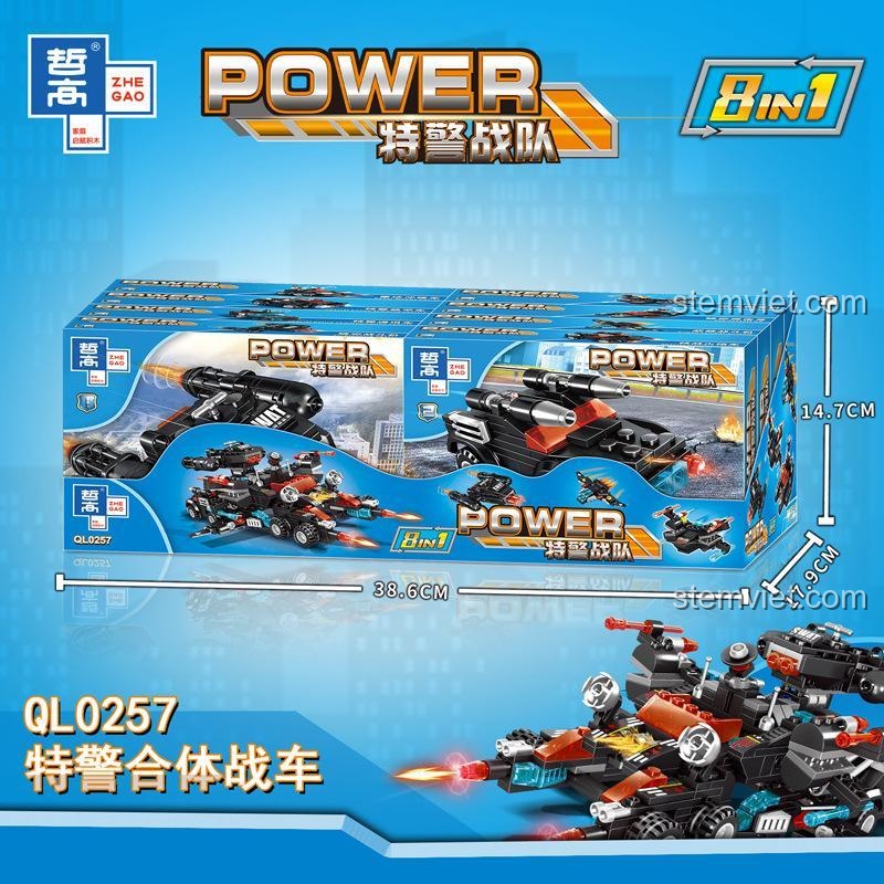 Giải phóng sức mạnh sáng tạo và tinh thần đồng đội với bộ lắp ráp **ZHEGAO QL0257 Xe Chiến Đấu Hợp Thể Đội Đặc Nhiệm SWAT 8 trong 1**! Đây không chỉ là một bộ đồ chơi thông thường, mà là cả một biệt đội tác chiến nằm gọn trong tay bé. Với khả năng lắp ráp thành **8 mô hình xe đặc nhiệm riêng lẻ** – từ xe chỉ huy, máy bay, tàu chiến đến xe bọc thép – mỗi chiếc lại có thể biến hóa thành một mẫu khác, nâng tổng số mô hình lên đến **10 kiểu khác nhau**!