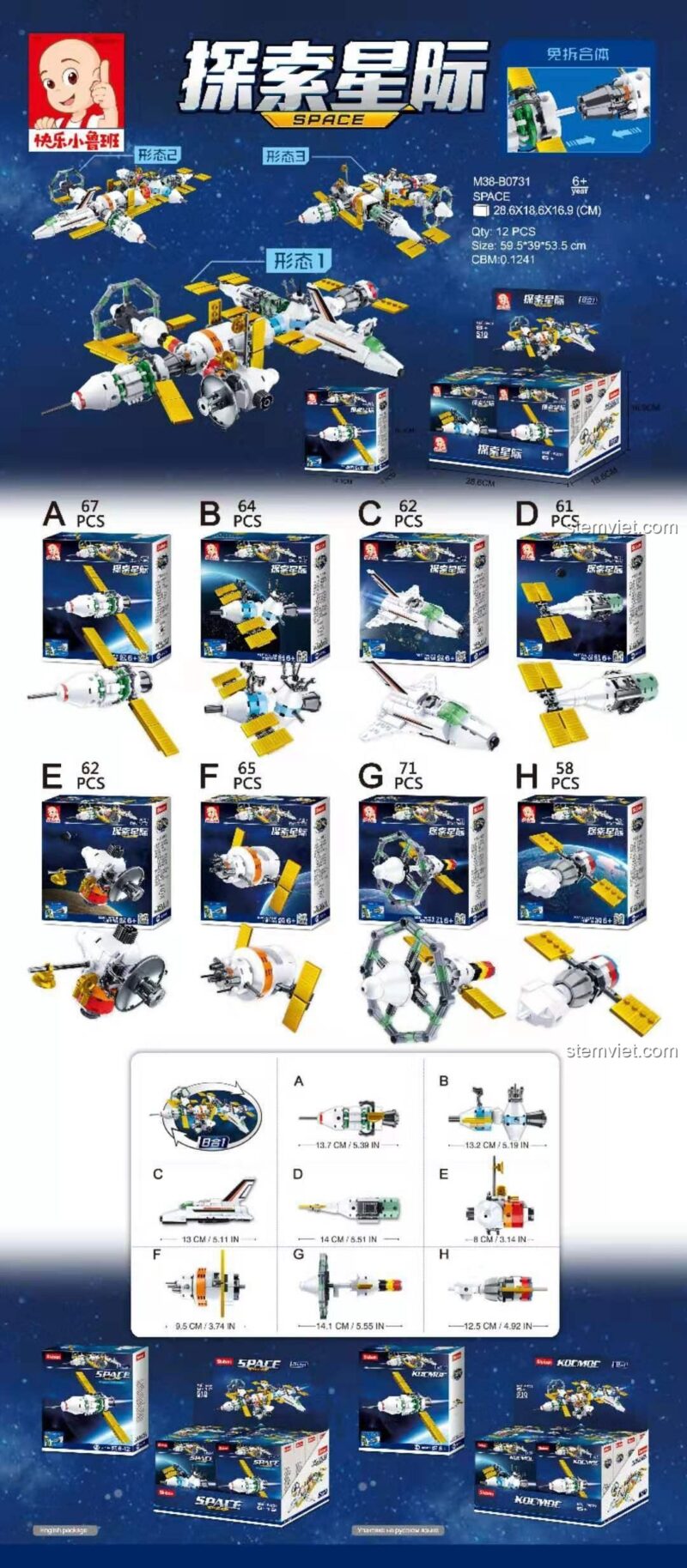 - Lắp ráp 8 mô hình không gian độc lập: Mỗi mô hình là một thử thách nhỏ, phù hợp để bé lắp ráp trong thời gian ngắn, duy trì sự hứng thú. Bé có thể tạo ra tàu con thoi, vệ tinh, tàu thăm dò… để thực hiện các nhiệm vụ riêng lẻ.