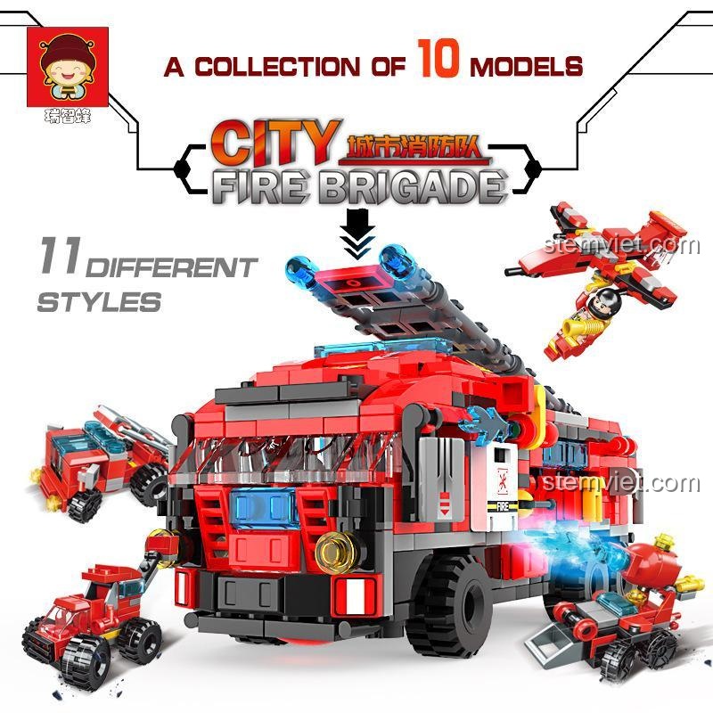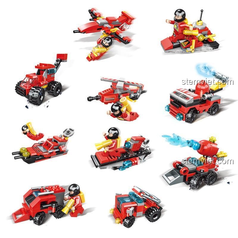 Bộ sản phẩm này vô cùng đa năng với 11 cách lắp ráp khác nhau. Bé có thể lắp thành 10 mô hình phương tiện cứu hỏa mini riêng biệt, hoặc kết hợp cả 10 mô hình đó lại để tạo thành 1 siêu xe cứu hỏa thang nâng khổng lồ.