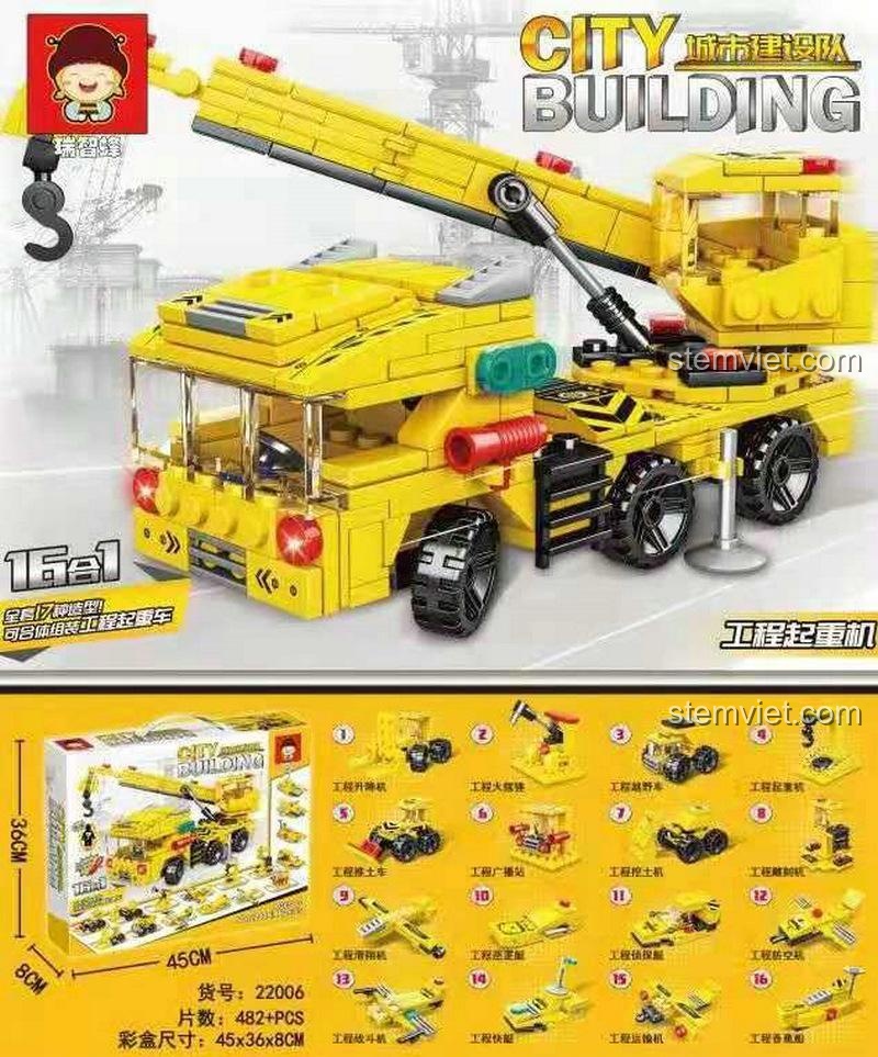 Điểm đặc biệt nhất của bộ xếp hình 22006 chính là thiết kế 17 trong 1 độc đáo. Từ một hộp duy nhất, bé có thể lắp ráp thành 16 phương tiện và công trình mini khác nhau, từ xe ủi, xe lu, máy bay, thuyền cứu hộ cho đến cả trạm phát sóng. Mỗi mô hình nhỏ là một thử thách lắp ráp thú vị, mang một chức năng riêng, cho phép bé thỏa sức sáng tạo các kịch bản chơi đa dạng. Nhưng điều kỳ diệu chưa dừng lại ở đó! Khi tập hợp đủ 16 mô hình, chúng sẽ kết hợp lại thành một siêu cần cẩu công trình khổng lồ, sừng sững và hoành tráng. Với tông màu vàng chủ đạo đặc trưng của các loại xe xây dựng, kết hợp với các chi tiết màu đen mạnh mẽ, mô hình cần cẩu lớn không chỉ là một món đồ chơi mà còn là một vật trưng bày ấn tượng trong phòng của bé. Từng chi tiết, từ cabin, cánh tay cẩu, bánh xe cho đến móc cẩu đều được thiết kế tỉ mỉ, mô phỏng chân thực, mang lại trải nghiệm lắp ráp và vui chơi vô cùng sống động.