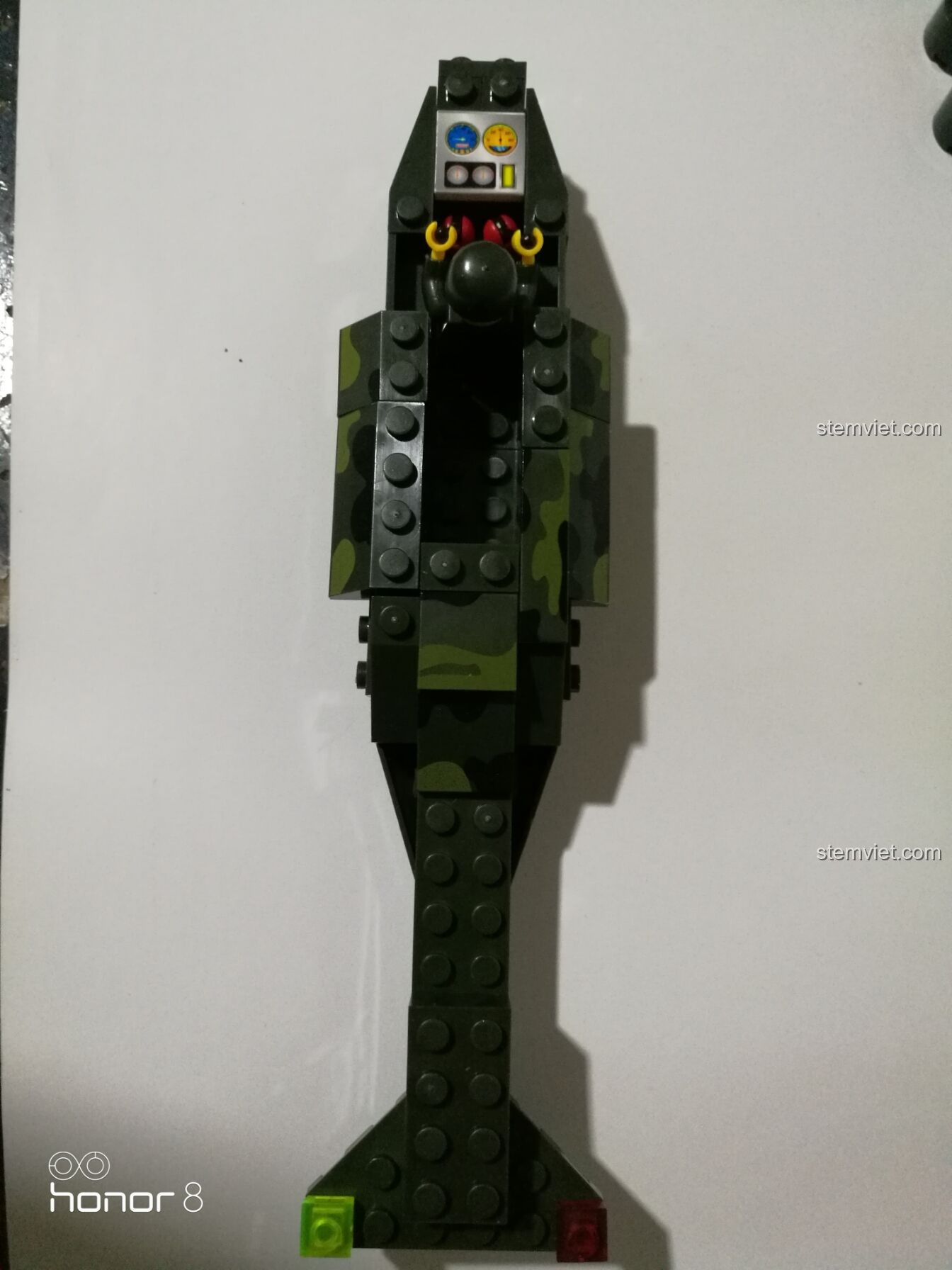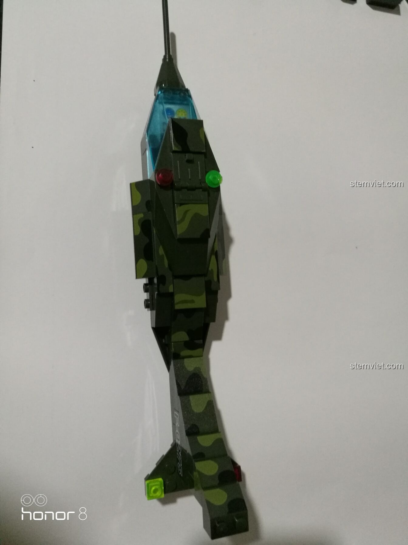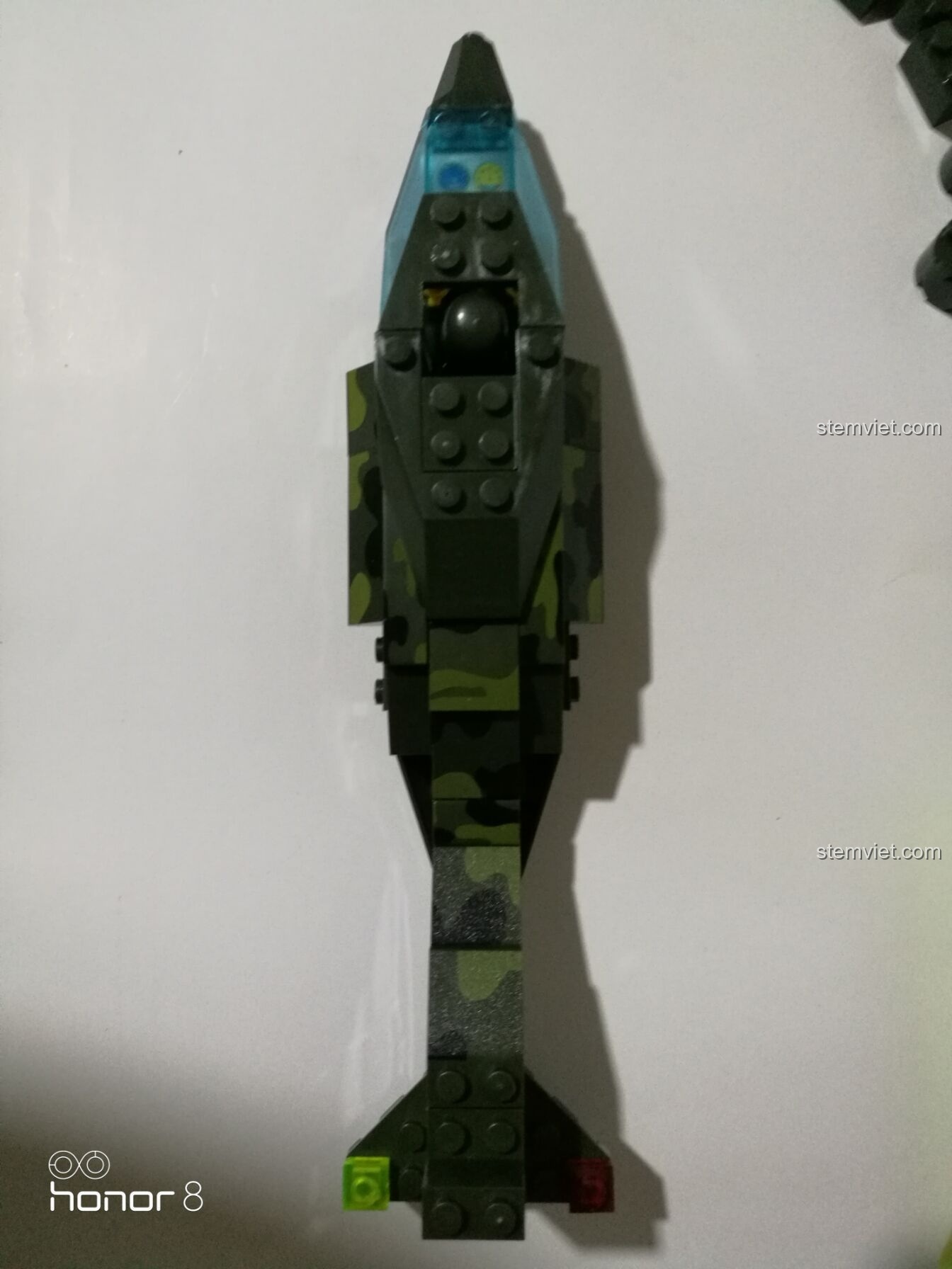 Ngay từ cái nhìn đầu tiên, mô hình lắp ghép 0275 đã gây ấn tượng mạnh mẽ với tông màu xanh quân đội chủ đạo, kết hợp với các họa tiết rằn ri (camo) đặc trưng, tạo nên một vẻ ngoài chân thực và đầy uy lực. Từng đường nét của chiếc tiêm kích được thiết kế tỉ mỉ, từ phần mũi nhọn khí động học, buồng lái với kính chắn gió trong suốt, cho đến phần cánh và đuôi vững chãi. Dưới hai cánh là hệ thống tên lửa với đầu đạn màu đỏ nổi bật, sẵn sàng cho mọi nhiệm vụ chiến đấu. Bộ sản phẩm còn đi kèm một minifigure phi công với bộ quân phục và mũ bảo hiểm, có thể đặt vừa vặn vào buồng lái, tăng thêm tính tương tác và nhập vai cho bé. Thiết kế nhỏ gọn nhưng đầy đủ chi tiết giúp bé dễ dàng cầm nắm và ‘thực hiện’ những phi vụ bay lượn ngoạn mục trong không gian tưởng tượng của mình.