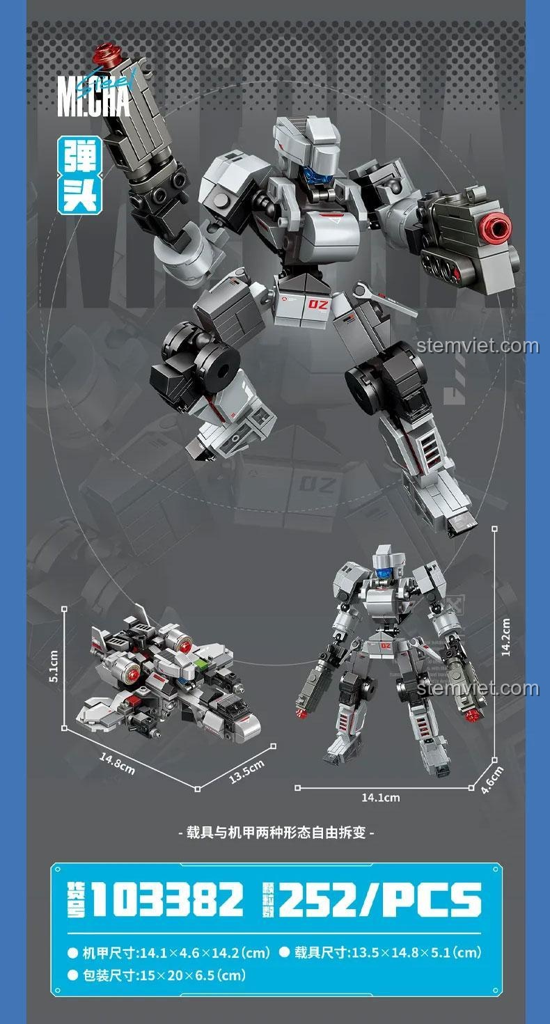 Ngay từ cái nhìn đầu tiên, đồ chơi mô hình SEMBO 103382 đã gây ấn tượng mạnh mẽ với thiết kế đậm chất cơ khí và tương lai. Tông màu chủ đạo xám bạc kết hợp với các chi tiết đen và điểm nhấn đỏ tạo nên một tổng thể hài hòa, mạnh mẽ và đầy uy lực. Từng đường nét, khớp nối đều được chăm chút tỉ mỉ, mang lại cảm giác của một cỗ máy chiến đấu thực thụ.
