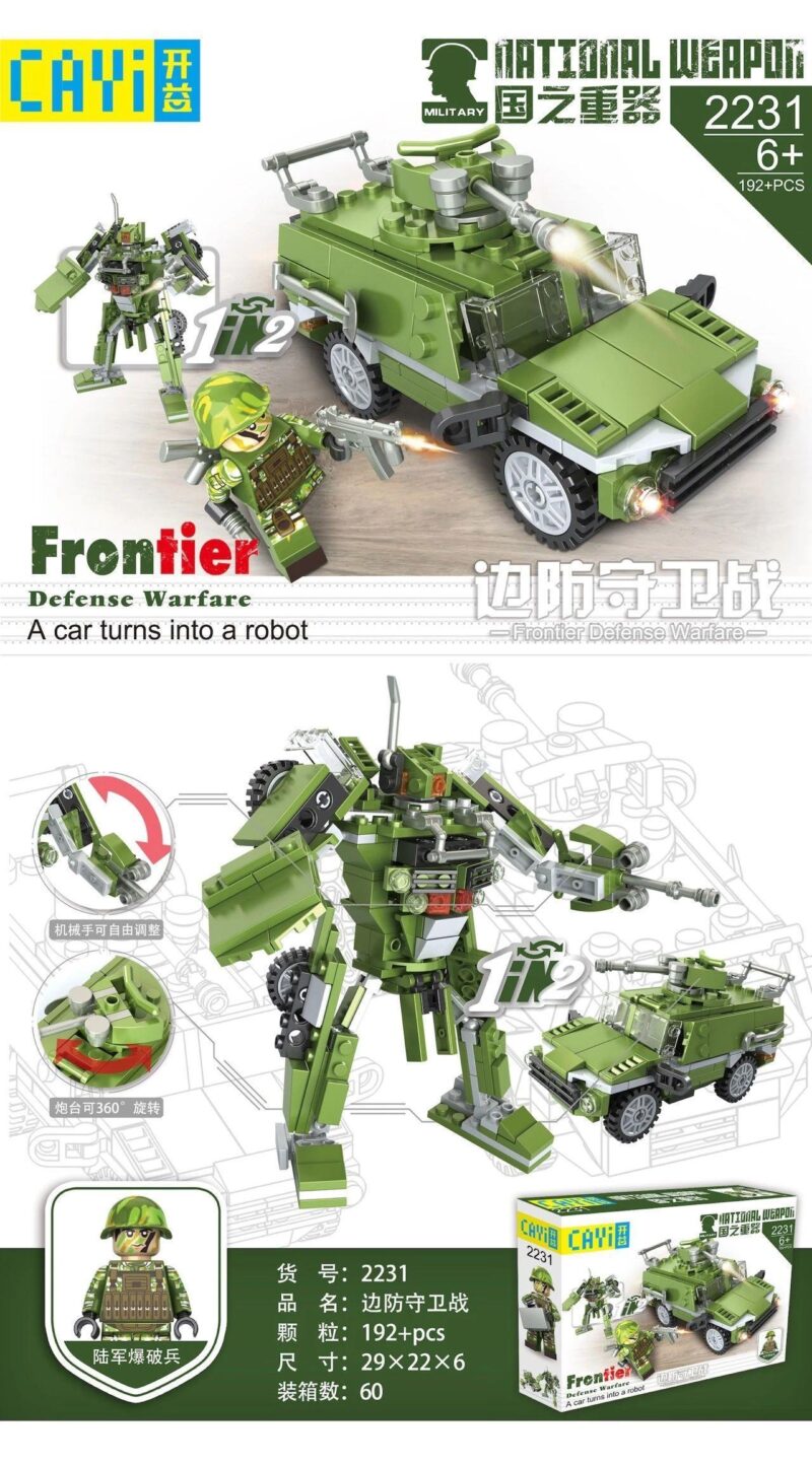 Điểm nhấn ấn tượng nhất của đồ chơi mô hình CAYI 2231 chính là thiết kế thông minh 2 trong 1. Với 192 mảnh ghép, bé có thể lựa chọn lắp ráp thành một trong hai dạng mô hình cực chất. Dạng thứ nhất là một chiếc xe chiến đấu phòng thủ biên giới với màu xanh lá quân đội đặc trưng, kết hợp cùng các chi tiết màu xám và đen tạo nên vẻ ngoài mạnh mẽ, lỳ lợm. Các bánh xe lớn, gai góc sẵn sàng chinh phục mọi địa hình. Trên nóc xe là một tháp pháo uy lực, có khả năng xoay 360 độ, cho phép bé ngắm bắn mục tiêu từ mọi hướng. Nhưng điều kỳ diệu chưa dừng lại ở đó! Chỉ với vài bước biến đổi, chiếc xe hầm hố này sẽ ‘lột xác’ thành một robot chiến binh cao lớn, dũng mãnh. Các chi tiết của xe được sắp xếp lại một cách khéo léo để tạo thành tay, chân và thân hình vững chãi cho robot. Cánh tay robot có thể điều chỉnh linh hoạt, sẵn sàng cho mọi tư thế chiến đấu. Thiết kế tinh xảo, chi tiết sắc nét và khả năng biến hình độc đáo này không chỉ mang lại giá trị thẩm mỹ cao mà còn kích thích trí tò mò và khả năng giải quyết vấn đề của trẻ.