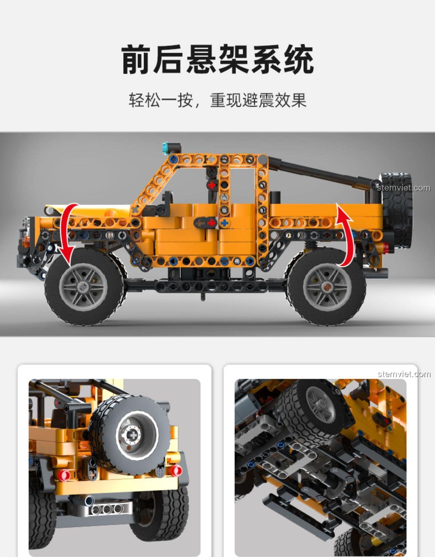 Hệ thống giảm xóc của đồ chơi lắp ghép Xe Off-road COGO 15800A được mô phỏng chân thực với các lò xo và khớp nối linh hoạt. Khi xe di chuyển qua các bề mặt gồ ghề, hệ thống này sẽ hấp thụ lực va đập, giúp xe giữ thăng bằng và di chuyển mượt mà, mang lại trải nghiệm lái xe địa hình sống động cho bé.