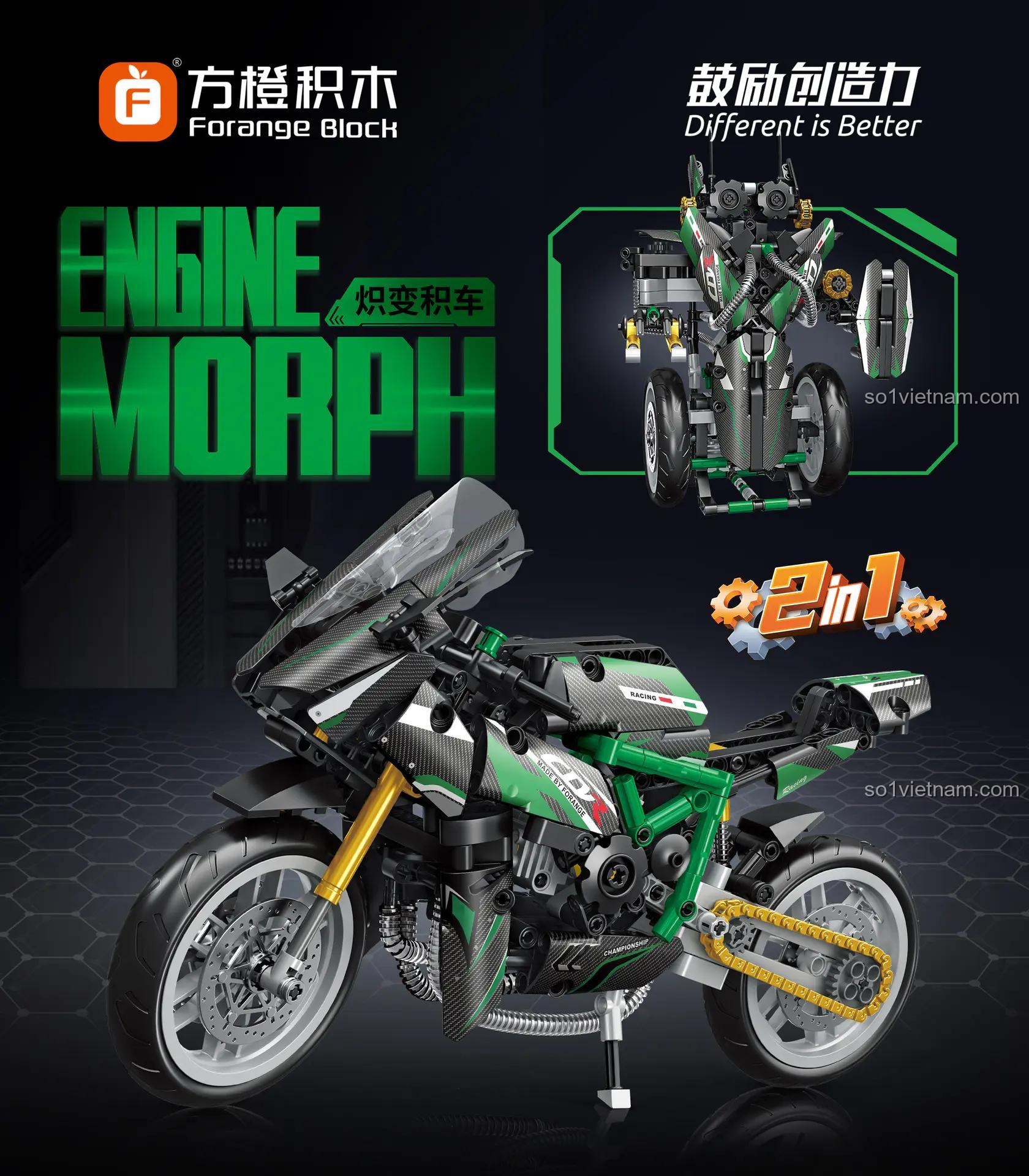 Mẹ có biết, trong trí tưởng tượng của cậu con trai 6 tuổi nhà mình, thế giới luôn đầy ắp những cuộc phiêu lưu kỳ thú không? Đó là những cuộc đua tốc độ nghẹt thở trên những cung đường vô tận, và cả những trận chiến hào hùng bảo vệ chính nghĩa. Thấu hiểu điều đó, Forange Block đã tạo ra một sản phẩm đột phá, kết hợp hai niềm đam mê lớn nhất của các bé trai: tốc độ và sức mạnh. Bộ lắp ráp FC9304 Engine Morph không chỉ là một món đồ chơi, mà là cánh cổng mở ra một vũ trụ sáng tạo, nơi một chiếc siêu mô tô có thể “lột xác” thành một robot chiến binh dũng mãnh. Đây không phải là một câu chuyện viễn tưởng, mà là một trải nghiệm lắp ráp đầy mê hoặc, nơi bé sẽ tự tay tạo nên kỳ tích biến hình của riêng mình, sẵn sàng cho mọi cuộc phiêu lưu do chính bé đạo diễn.