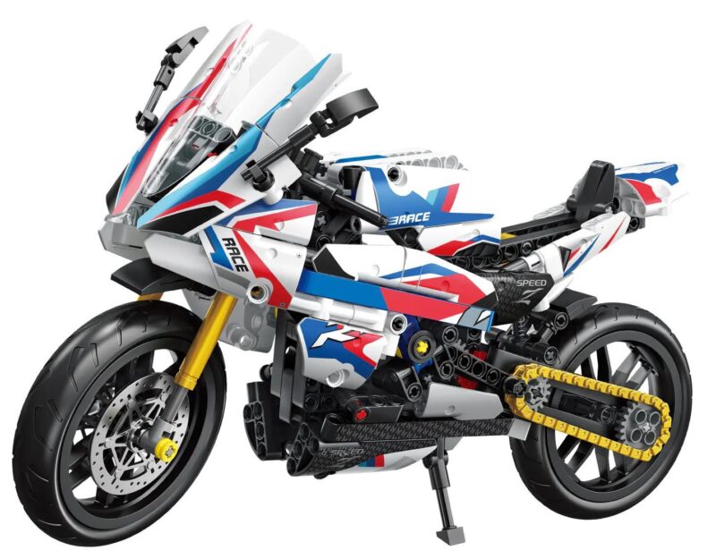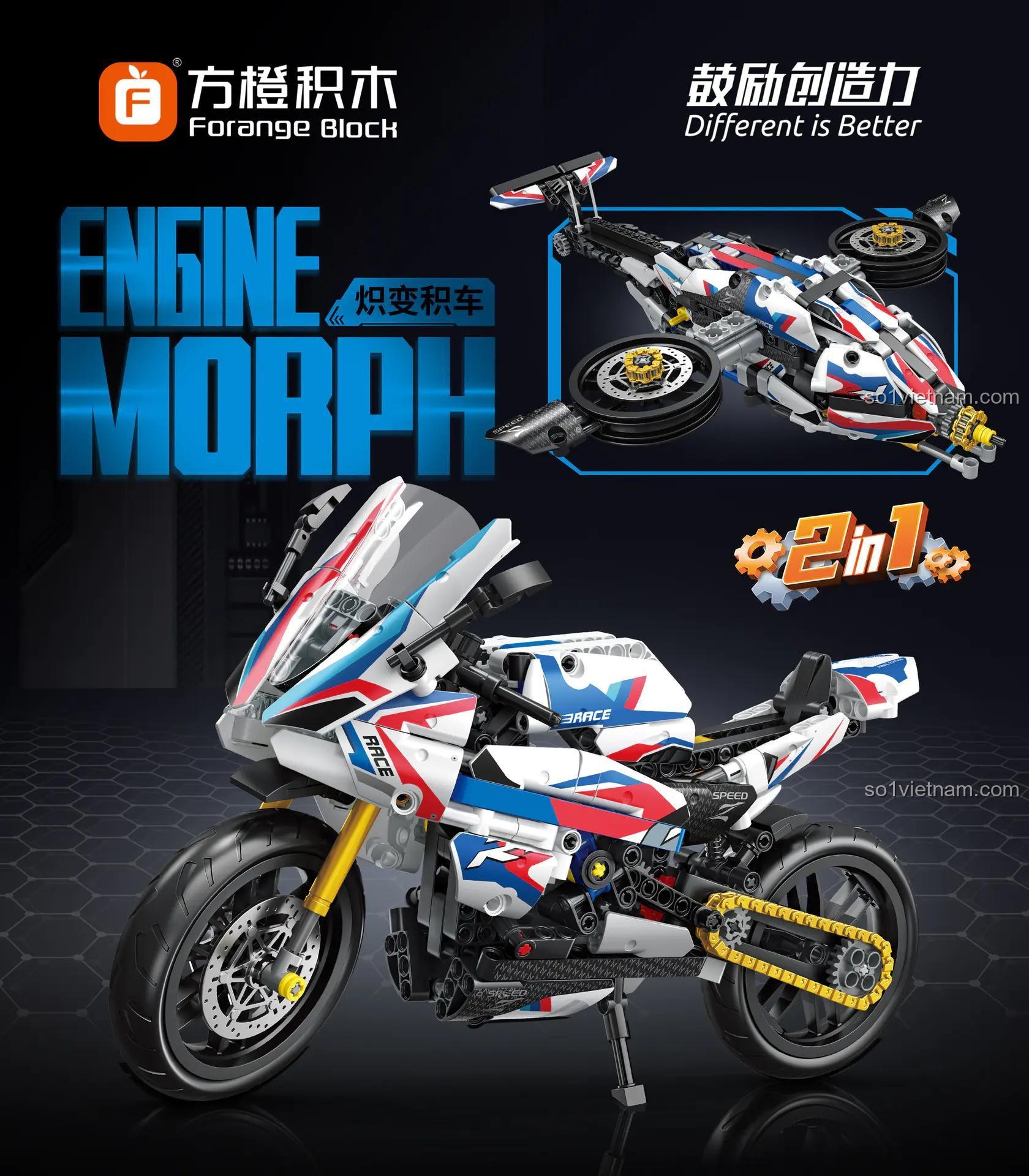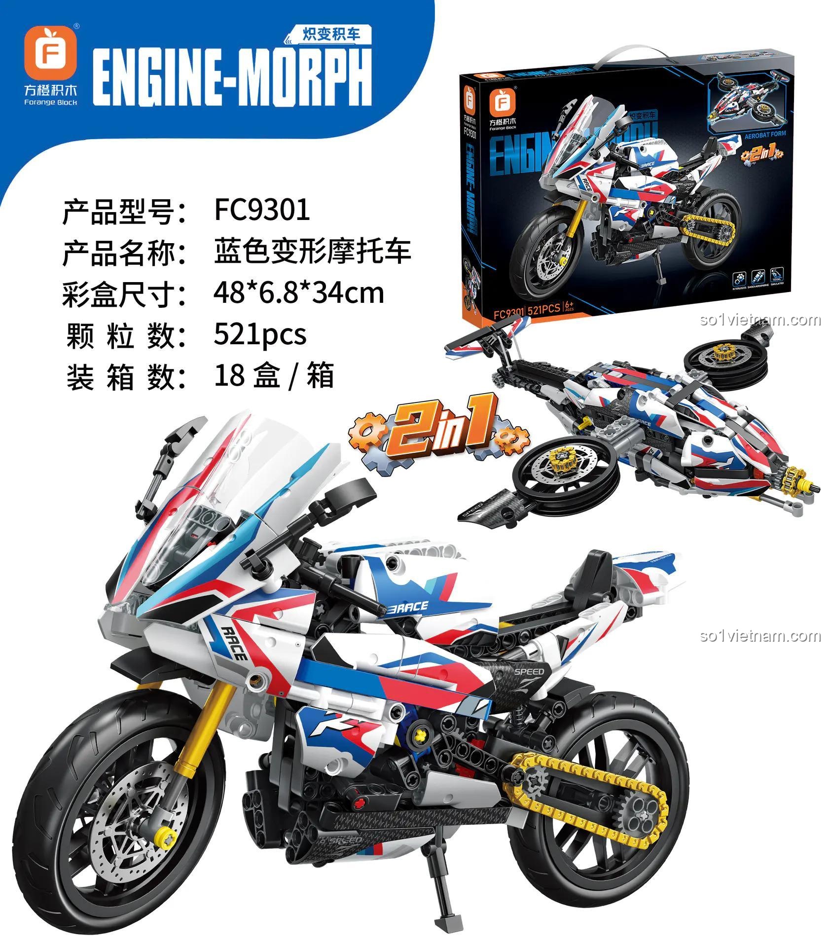 Ngay từ cái nhìn đầu tiên, đồ chơi mô hình Forange FC9301 đã chinh phục mọi ánh nhìn bởi thiết kế đậm chất thể thao và khí động học. Ở dạng xe mô tô, mô hình khoác lên mình bộ áo Trắng – Xanh dương – Đỏ đầy cá tính, gợi nhớ đến những chiếc xe đua lừng danh trên thế giới. Từng chi tiết nhỏ nhất như hệ thống truyền động xích vàng óng, phuộc nhún, phanh đĩa, và ống xả đều được tái hiện một cách tỉ mỉ, mang lại cảm giác chân thực đến kinh ngạc. Các khối lắp ghép kiểu Technic không chỉ tạo nên một kết cấu vững chắc mà còn phô diễn vẻ đẹp cơ khí đầy mê hoặc.