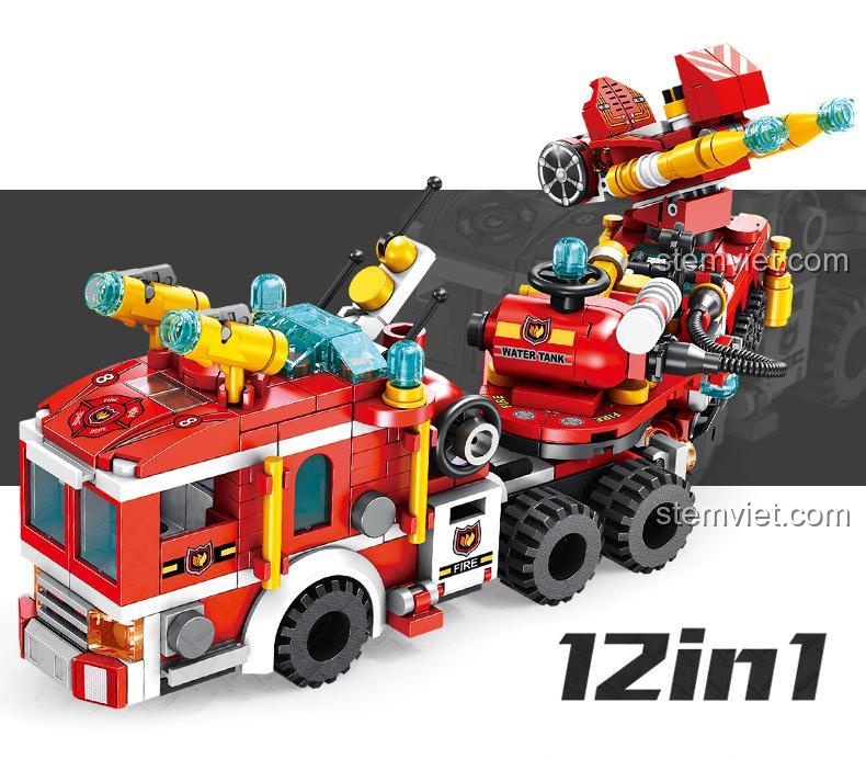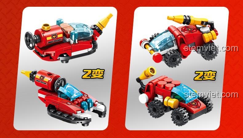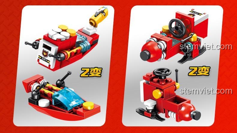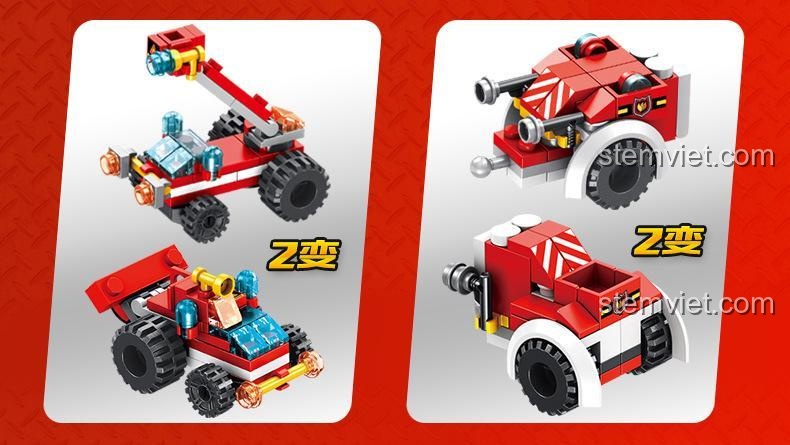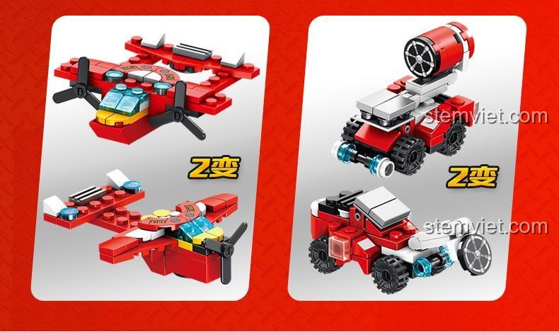 Điểm đặc biệt nhất của bộ đồ chơi này chính là khả năng biến hình đa dạng đến kinh ngạc. Từ 557 mảnh ghép, bé có thể tạo ra 12 phương tiện cứu hỏa mini khác nhau, từ xe thang, xe phun nước, trực thăng cứu hộ, tàu cao tốc cho đến các loại xe địa hình chuyên dụng. Mỗi phương tiện này lại có thể biến đổi thành một dạng thứ hai, nâng tổng số mô hình nhỏ lên 24! Nhưng điều kỳ diệu nhất vẫn chưa dừng lại. Khi tập hợp đủ 12 xe, chúng có thể kết hợp lại với nhau để tạo thành một Robot Cứu Hỏa hợp thể khổng lồ, oai vệ và mạnh mẽ. Với tông màu đỏ đặc trưng của ngành cứu hỏa, kết hợp với các chi tiết trắng, đen, vàng, mỗi mô hình đều trông vô cùng bắt mắt và sống động. Các chi tiết được thiết kế tỉ mỉ, từ vòi rồng, thang, đèn hiệu cho đến buồng lái, mang lại cảm giác chân thực như một đội cứu hỏa thực thụ đang thu nhỏ trong tay bé.